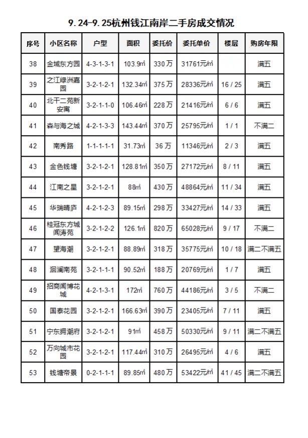 9.24-9.25杭州钱江南岸(滨江和萧山)二手房成交数据分享,近两日共成交53套,静待一波新政效果如何!