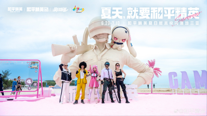 在三亚海滩上,《和平精英》复刻了粉色沙滩等游戏特色内容,让玩家在现实场景中也能感受到“和平风”的独特魅力;线上也通过实景植入,在游戏内加入了大小洞天、爱情鸟巢和水晶礼堂等三亚地标。