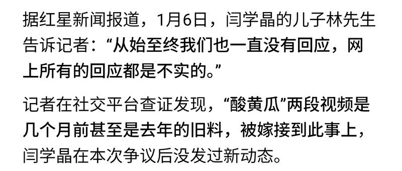 另外关于“酸黄瓜”事件,也迎来了重大反转。据权威媒体调查显示,原来相关视频不是最近的回应,而是以前的视频被嫁接到近期发生的事件上。闫学晶和她的儿子,从始至终都没有回应过。