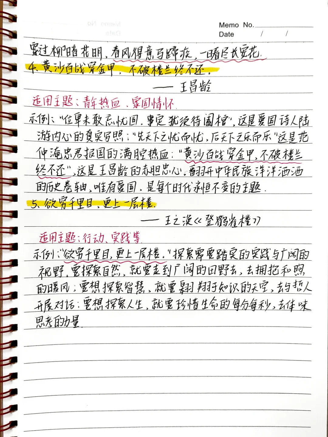 哈喽,大家过国庆快乐吖~ 今天分享的是一期古诗词作文素材哟 ⛰仰天大笑出门去,我辈岂是蓬蒿人。 ⛰人生万事须自为,跬步江山寂寥廓。 ⛰春风得意马蹄疾,一日看尽长春花。 ⛰黄沙百战穿金甲,不破楼兰终不还。 ⛰欲穷千里目,更上一层楼。