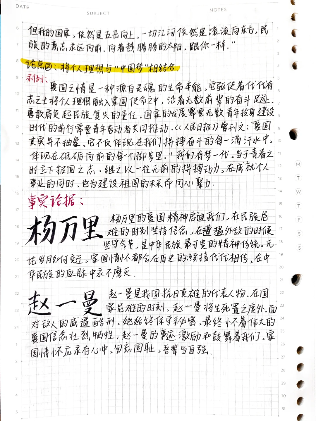 🇨🇳家国情怀是中华文化的重要组成部分,也是凝聚一个,国家或民族的深层情感纽带,它是一种朴素的情感,抒发着人们对于家园与故土的深情依恋,它也是一种热烈的情怀、蕴含着人们对于国家繁荣富强的坚定信念与使命感。 ⛰标题 ⛰道理论据 ⛰论点①:热爱祖国,心怀天下 ⛰论点②:将个人理想与“中国梦”相结合 ⛰人物素材: 📩杨万里 🌷赵一曼