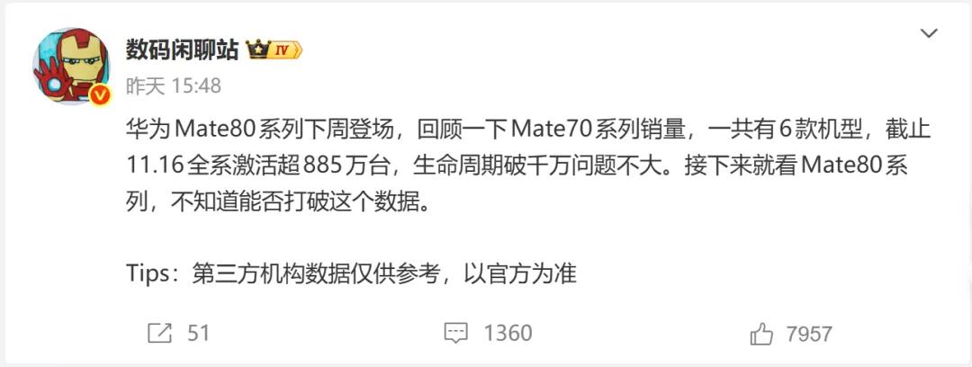 而就在昨天,数码闲聊站公布了截至目前华为Mate70系列的总销量——共六台机器,全系销量885万台。
