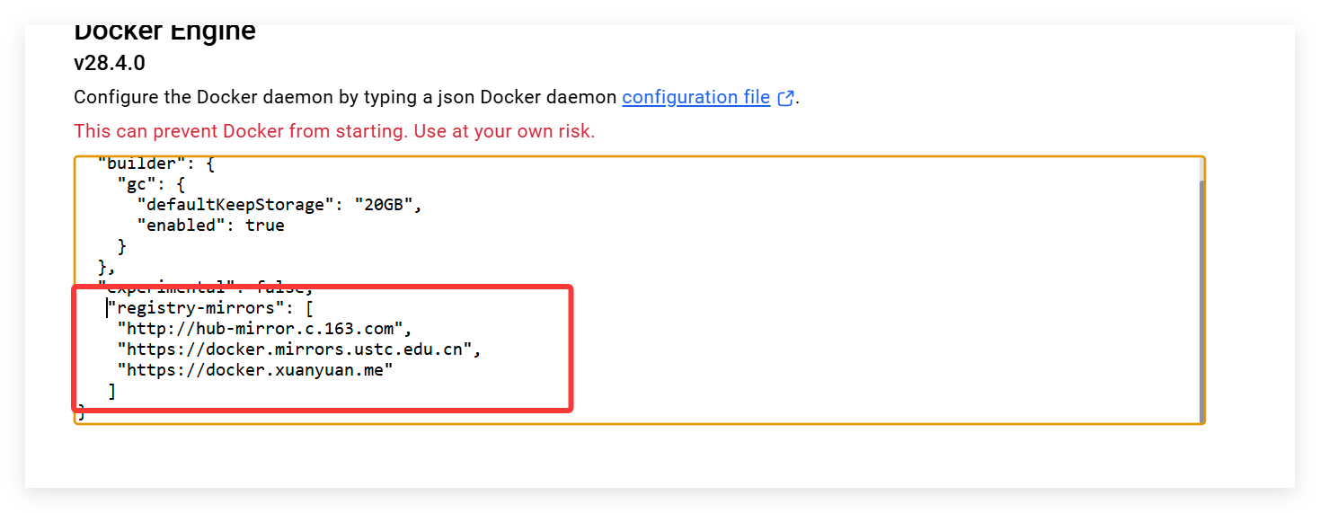 接着在 DockerDesktop 的设置中选择“Docker Engine”,在右侧输区域中增加如下配置: