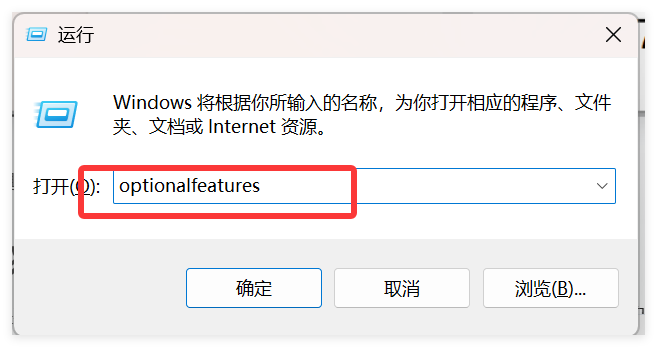 查看方式还是按 Win + R键,在弹出的页面中输入“optionalfeatures”:
