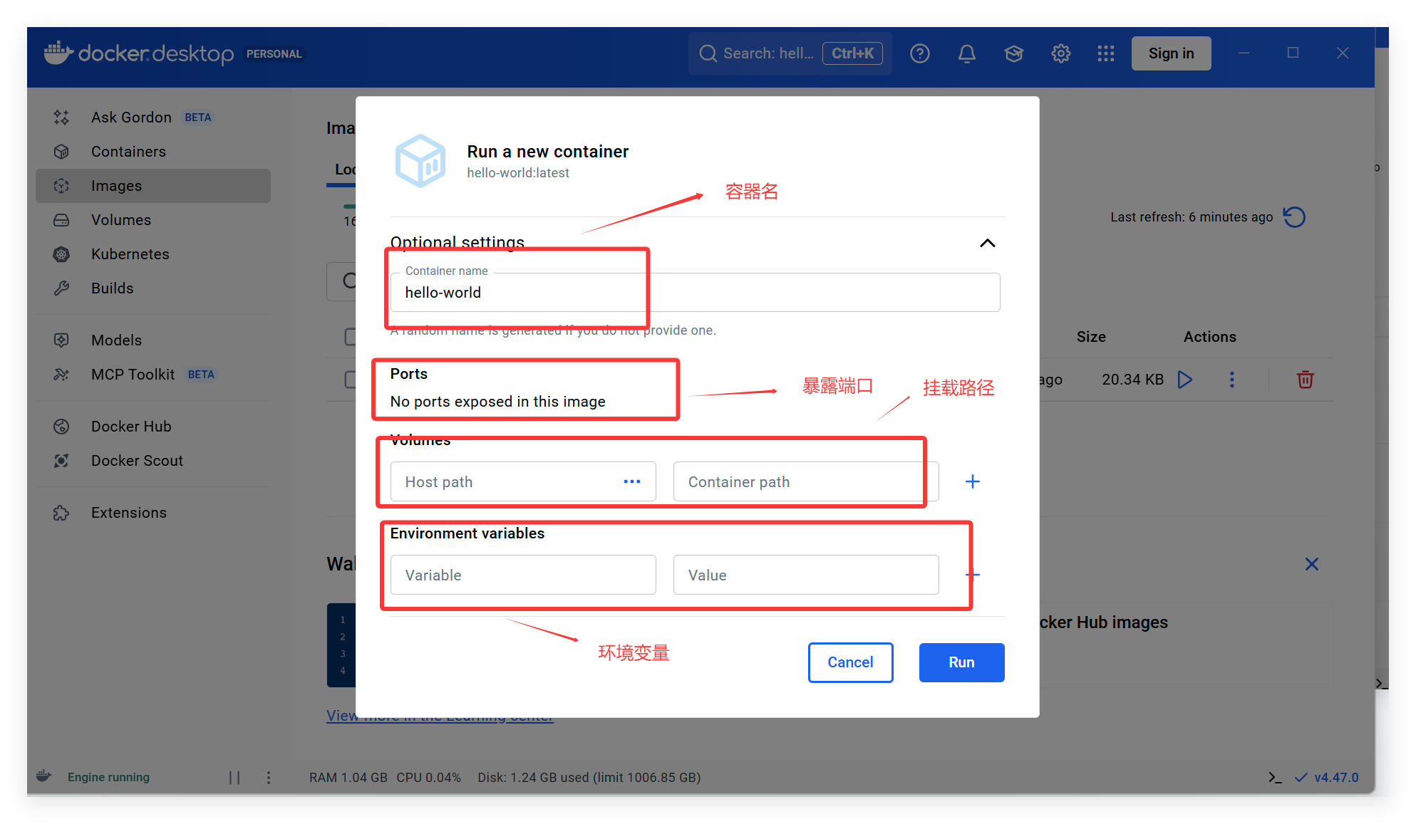 点击“Optional settings”便能进行一些通用设置,如设置环境变量、容器名等: