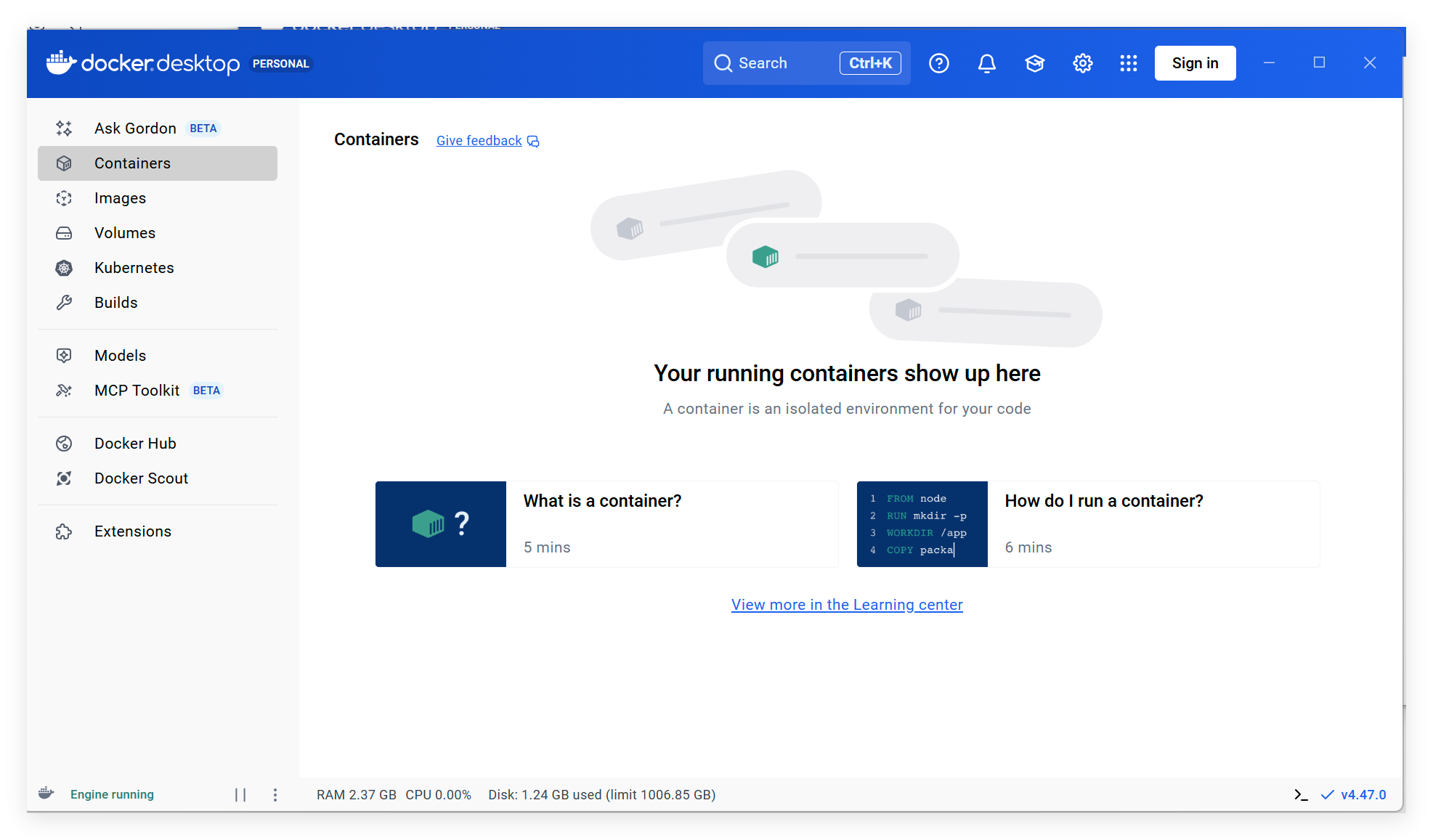 点击“Run”便会跳到 “Container”页面: