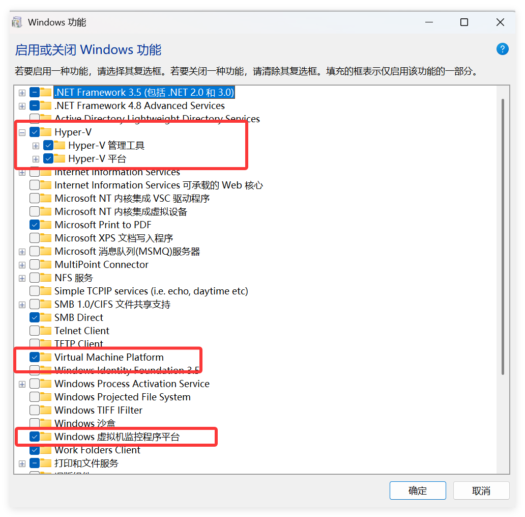 2.3 启用 Hyper-V 开启虚拟化任务之所以要开启 Hyper-v,根本原因也是在于 WSL 依赖于该功能。当然, Hyper-v本身也是 Windows 内置的虚拟机。尽管易用性方面比 VMWare差点,但性能方面丝毫不逊色,至少本人没感觉出差异。