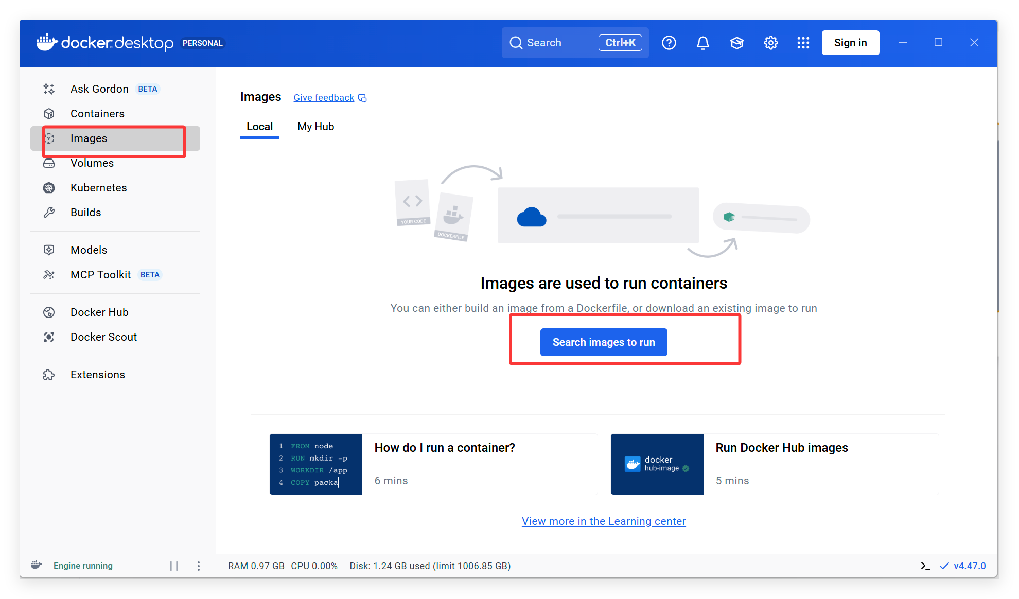 首先点击“Images” ,然后点击“Search image to run”: