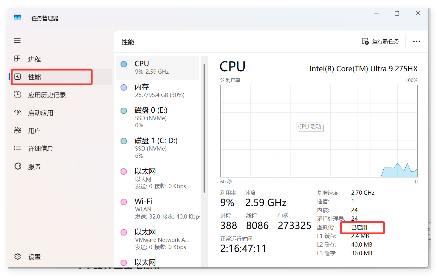 按下 “Ctrl + Shift + Esc”打开任务管理器,查看虚拟化是否为已启用: