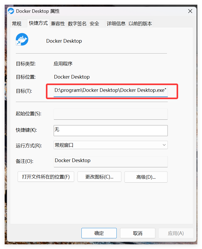 查看桌面快捷方式的属性也可以发现,其安装目录在命令指定的目录: