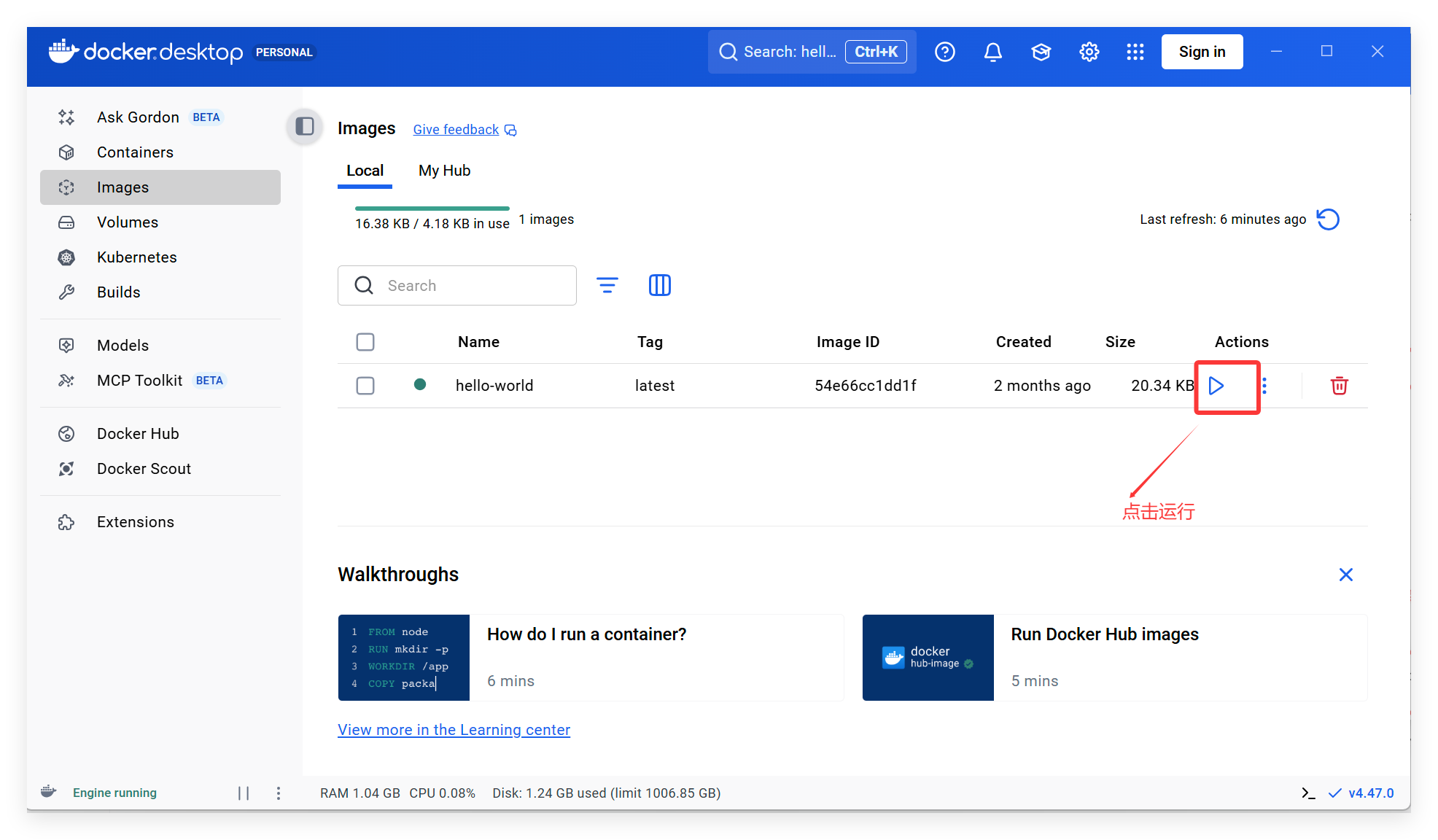 接着点击下图所示位置来基于该镜像创建并运行容器: