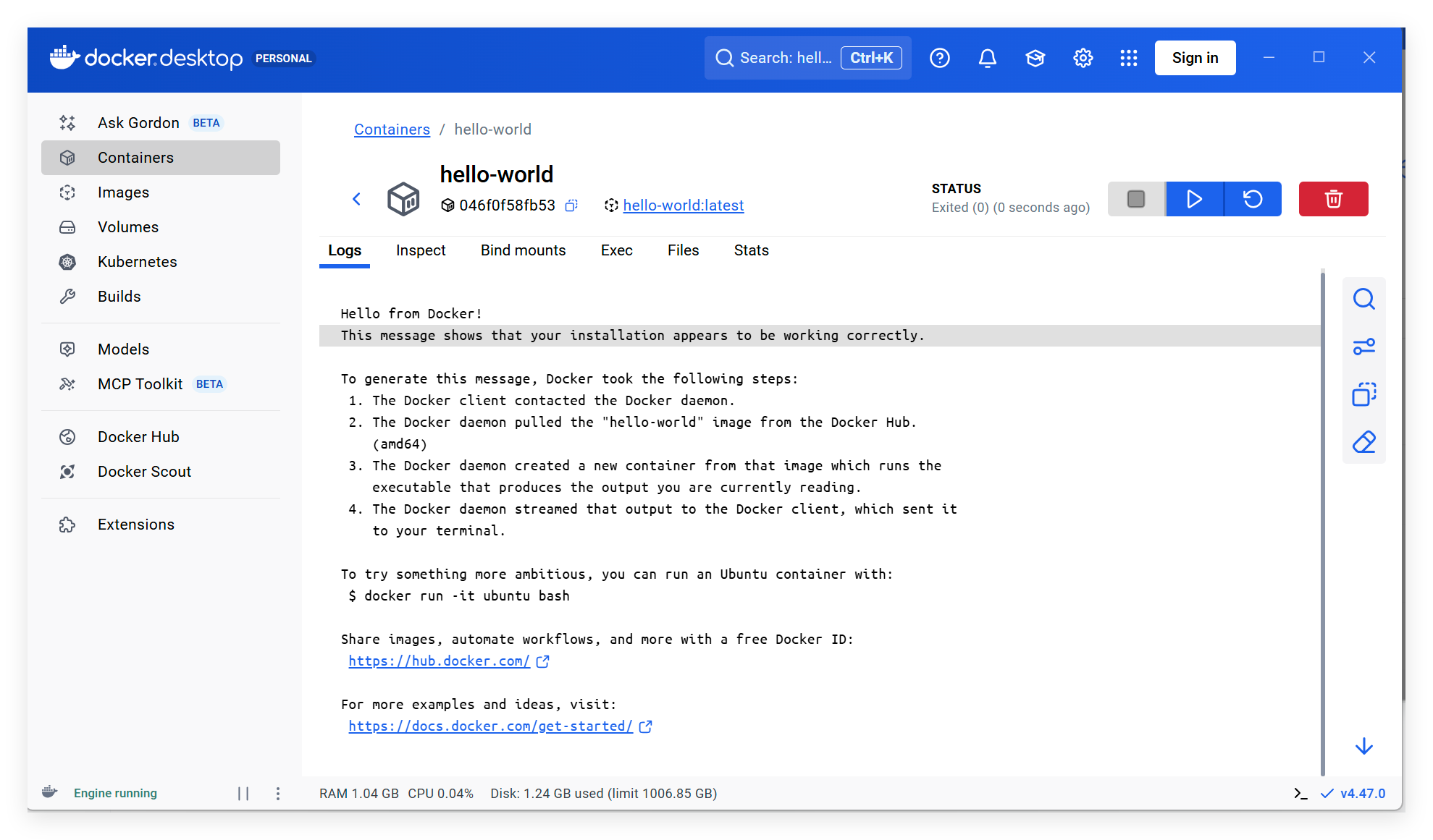 当然,最快捷的方式还是使用命令,直接在 CMD 中执行 “docker run hello-world”也能达到这种效果。