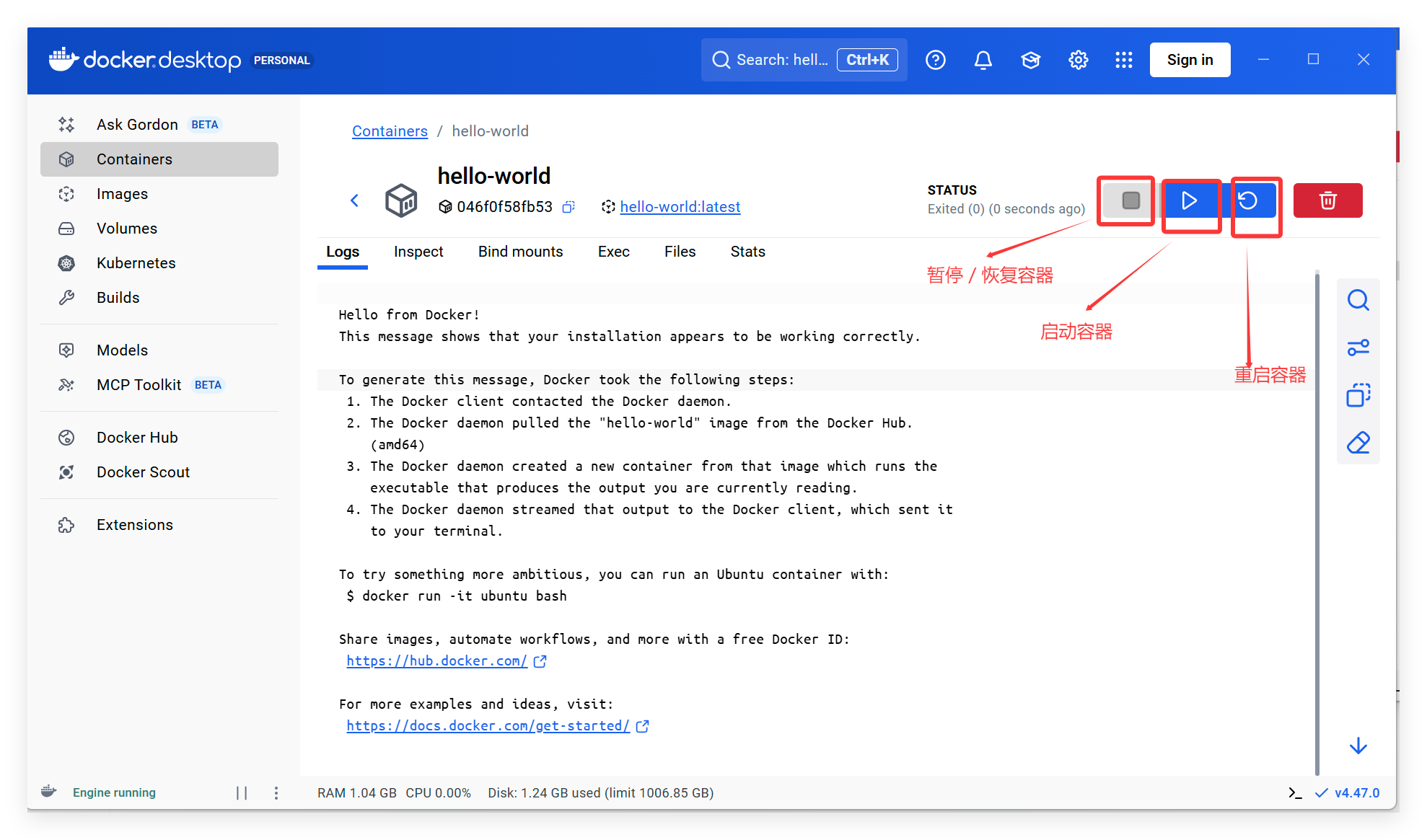 此时相当于已经基于镜像创建了指定容器,该容器旁边几个图标的含义如下所示: