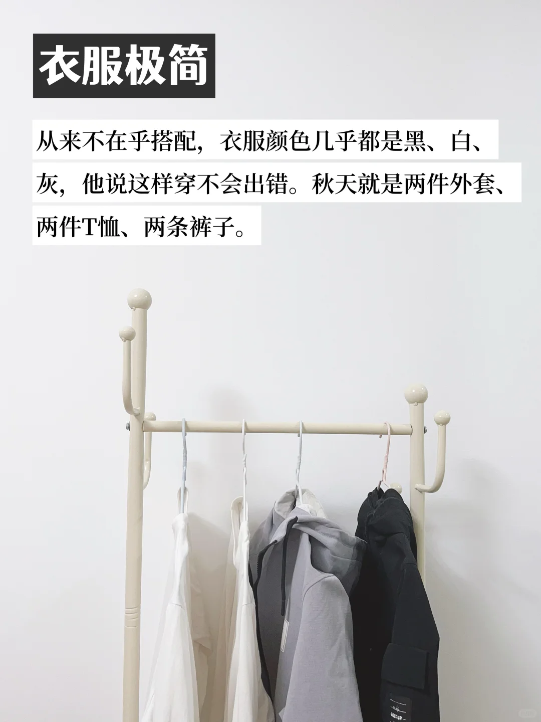 从来不在乎搭配,衣服颜色几乎都是黑、白、灰,他说这样穿不会出错。秋天就是两件外套、两件T恤、两条裤子。