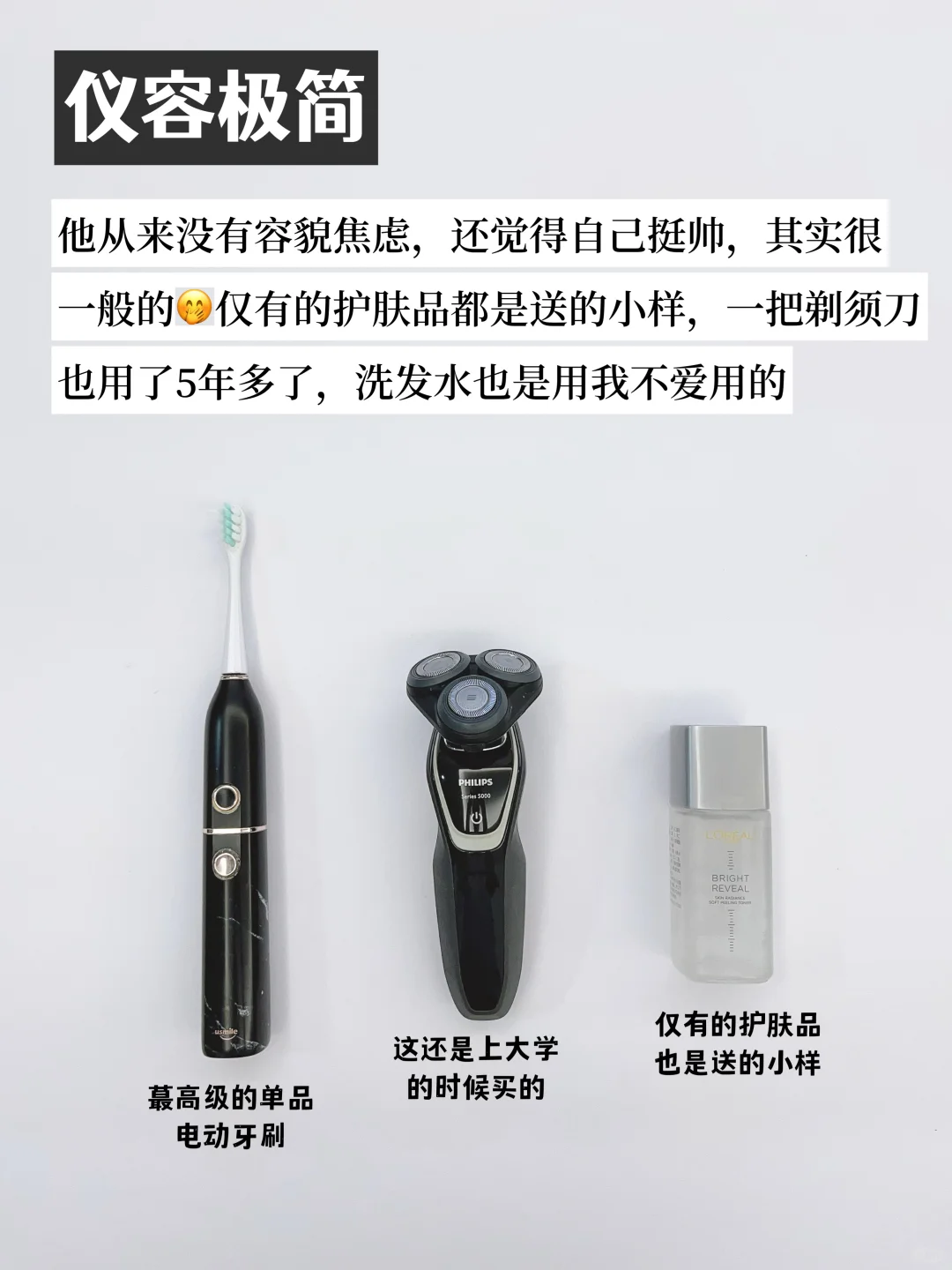 他从来没有容貌焦虑,还觉得自己挺帅,其实很一般的🤭仅有的护肤品都是送的小样,一把剃须刀也用了5年多了,洗发水也是用我不爱用的。