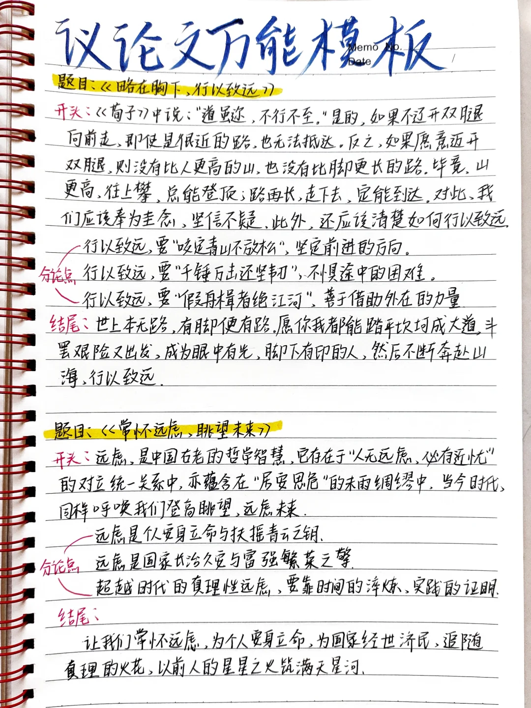 一期议论文万能模板分享 ⛰标题《略在胸下,行以致远》 《常怀远虑,思虑未来》 ⛰开头 ⛰分论点 ⛰结尾