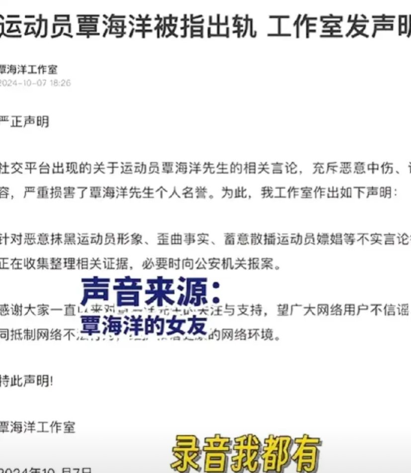 运动员覃海洋被女友曝光PC 据说其女友为他花了不少钱 在男女朋友期间 被女友企业家曝光出轨 而覃海洋工作室却声明不实是谣言 必要时会报J 而企业家女友却放话 去报案吧去取证吧 反正手里有他pc证据还有录音 到底谁是谁非 调查一下不就清楚了吗 还他一个清白呗