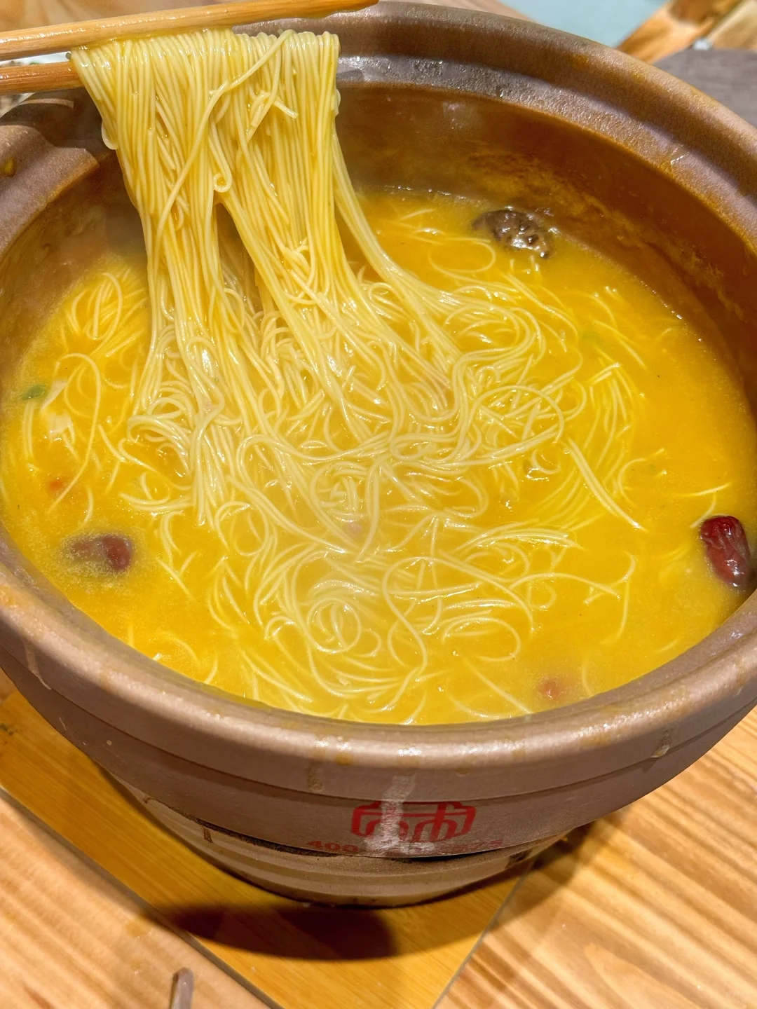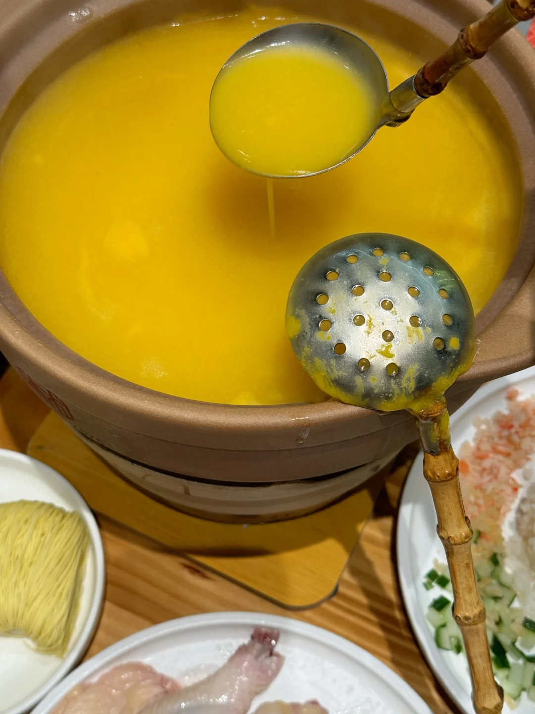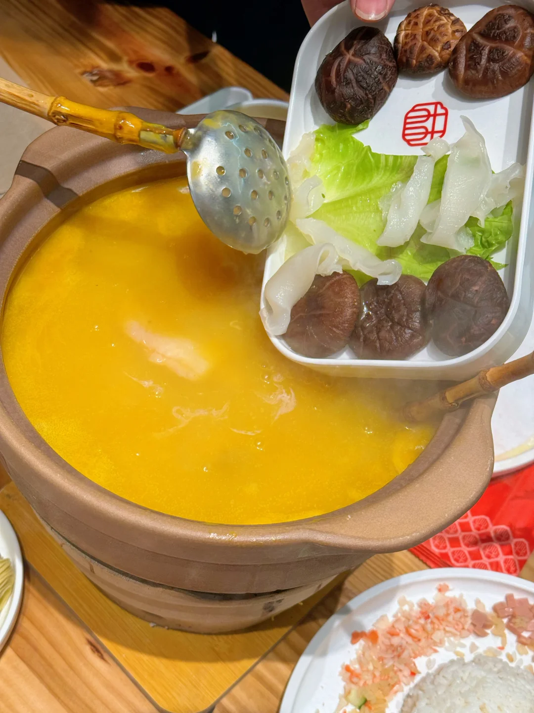 整个鸡煲端上来,金灿灿的汤底!!粘稠感十足