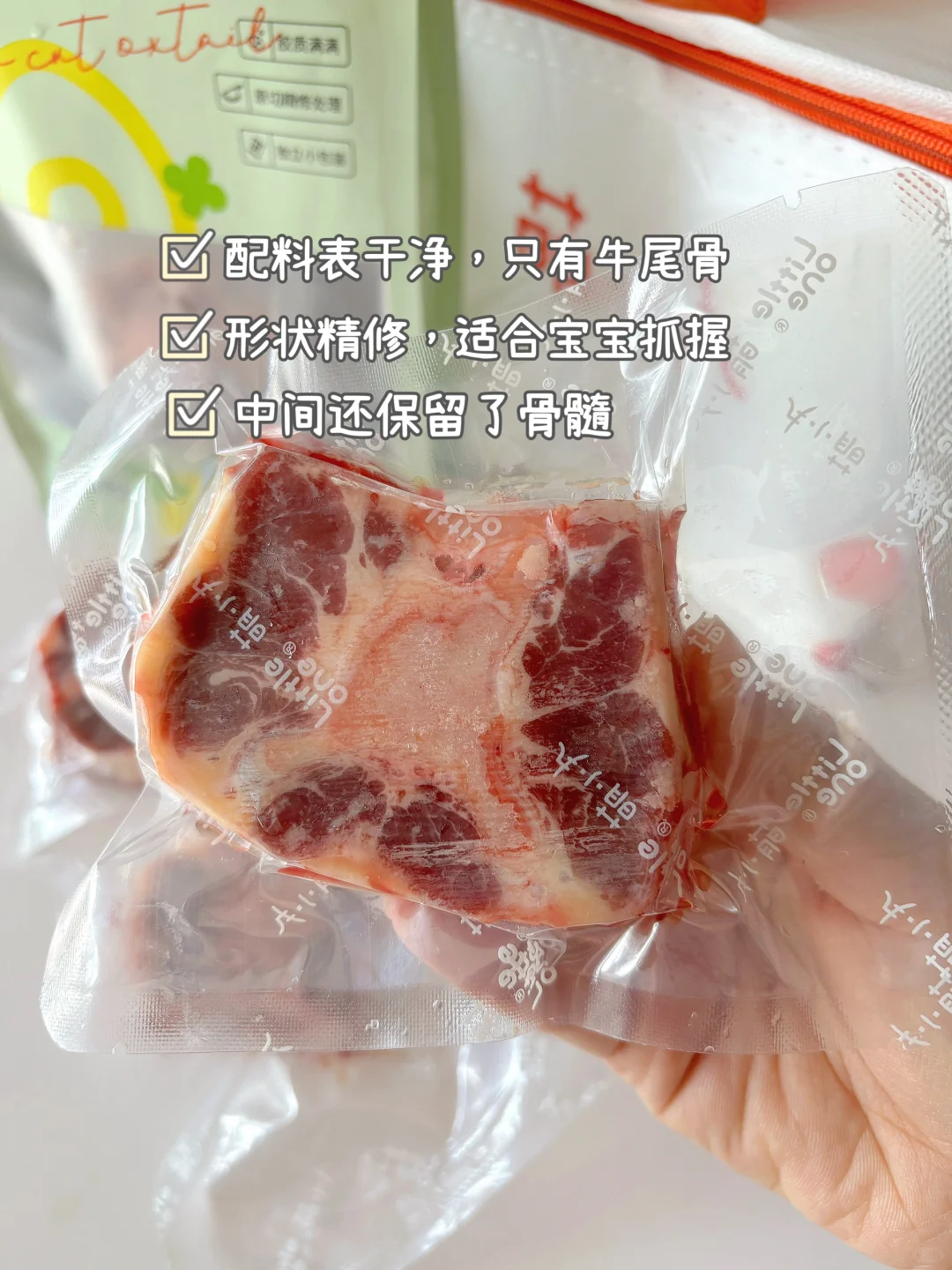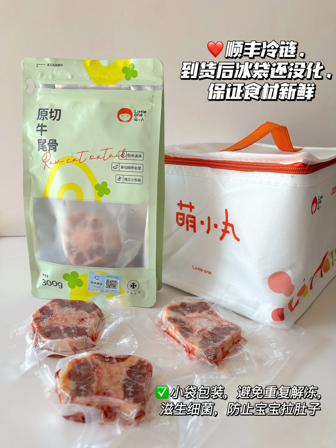 而且用的是顺丰冷链,到货时冰袋还没化,保证了食材的新鲜,牛尾骨也是小袋分装的,避免反复解冻从而滋生的细菌,每块牛尾骨的形状都是精修的,方便宝宝抓握哦,一次一袋,方便且好控制量~