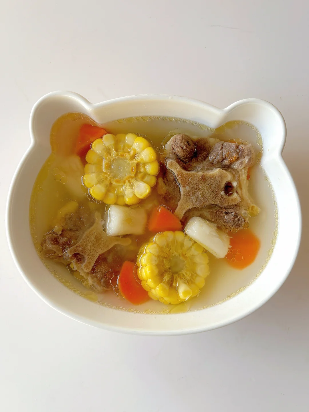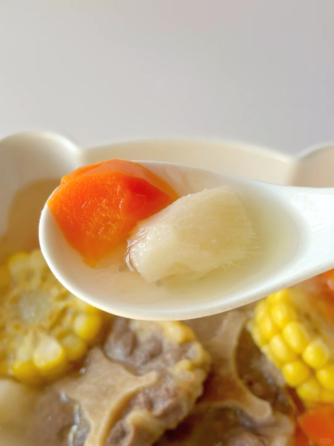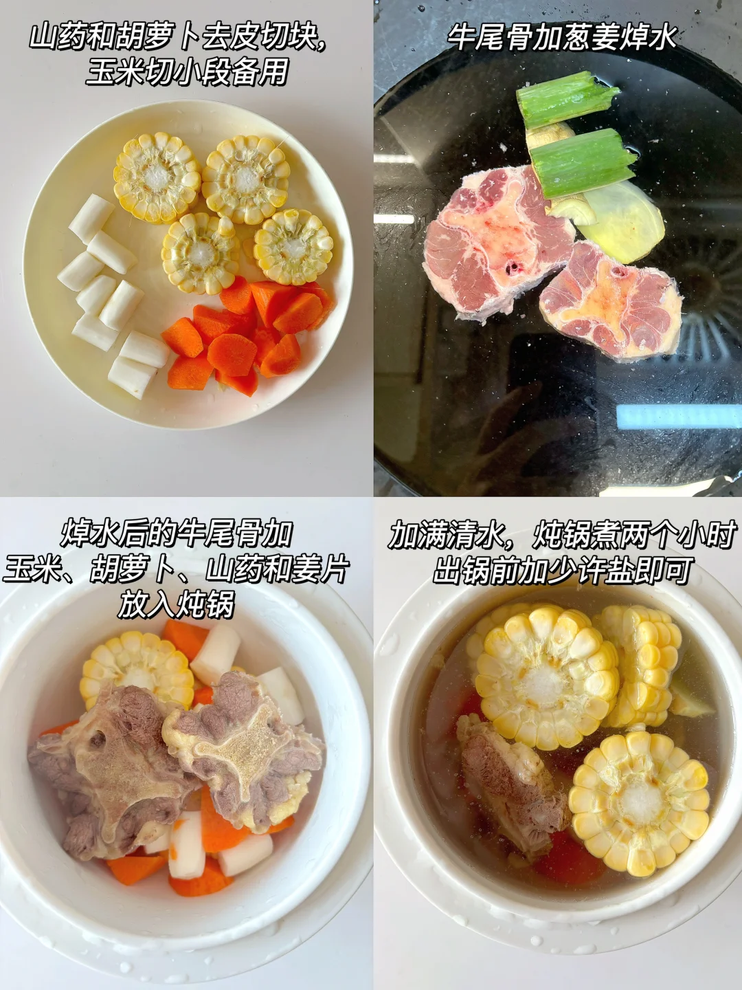 2️⃣ 焯水后的牛尾骨加玉米、胡萝卜、山药和姜片放入炖锅,加满清水,炖锅煮两小时,出锅前加少许盐即可。