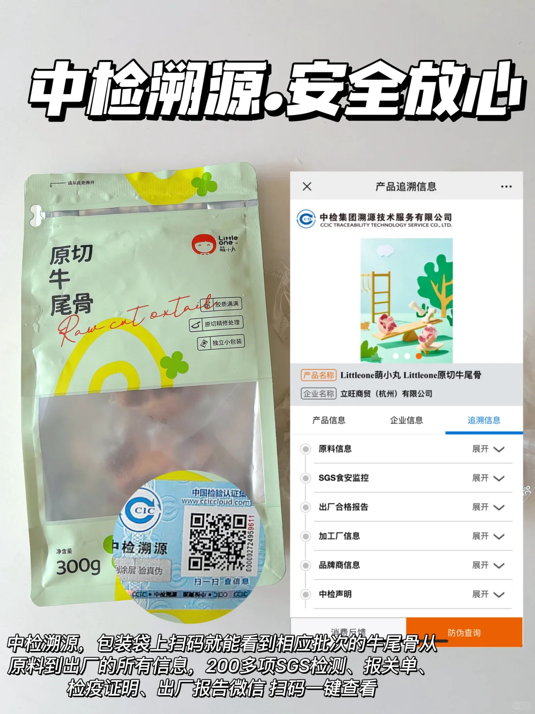 萌小丸牛尾骨的配料表非常干净,只有牛尾骨,家长们可以放心选购。而且中检溯源,包装袋上扫码一键查看 ,200多项SGS检测、报关单、检疫证明、出厂报告。