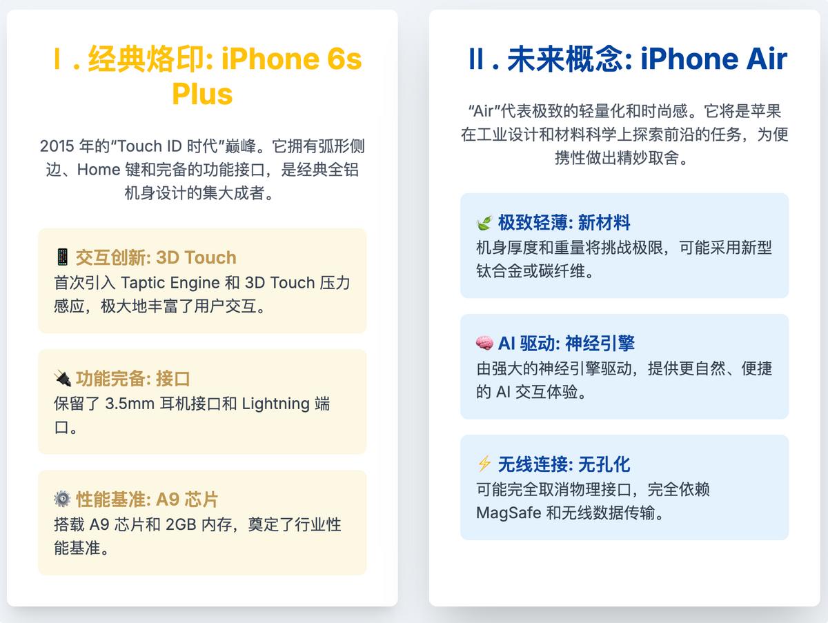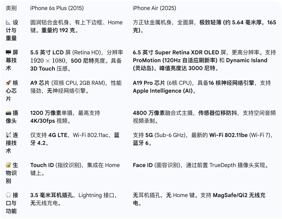 随着苹果向实用主义妥协,这几年的iPhone离设计越来越远,直到今年iPhone Air的发布,让我重新找到了iPhone精致感。于是我从收藏柜中拿出了我的第一台iPhone 6s Plus。虽然两个手机横跨十年,两个时代、两种设计哲学的碰撞,差异巨大,但有趣的是,在某些设计理念上仍有共通之处。