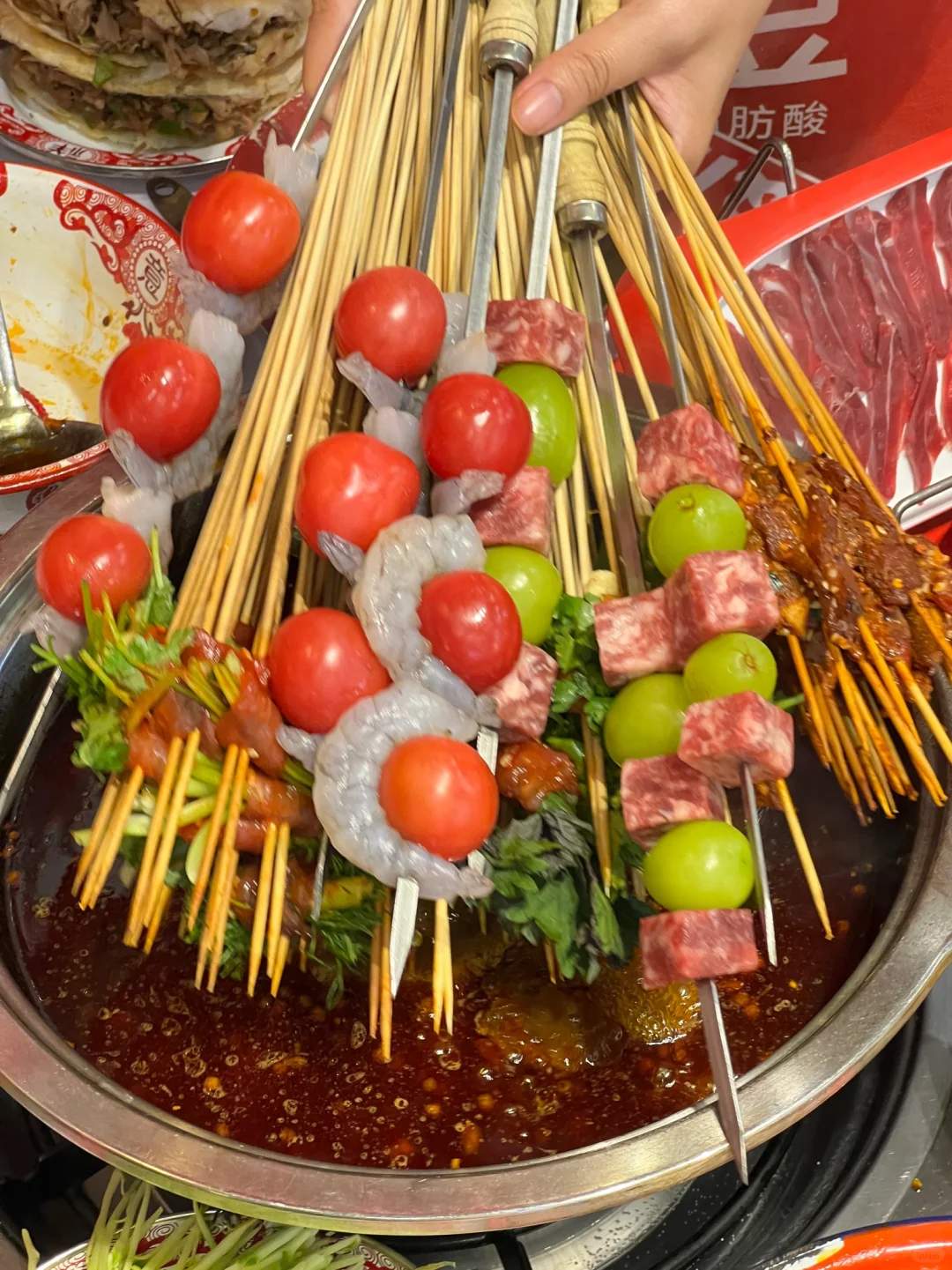 😋牛肉串串也很有特色,牛肉鲜嫩,小茴香牛肉串,香菜牛肉串,酸豆角牛肉串等等,各种菜品香味与牛肉完美融合加上浓浓的麻辣锅底,别提了🥰🥰🥰👍🏻