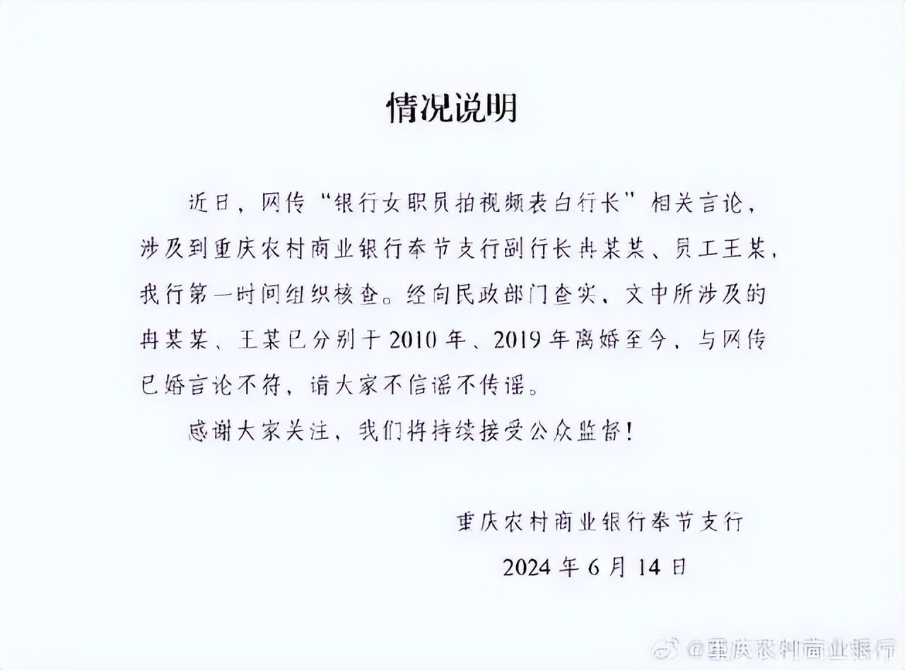 官方通报:近日,网传“银行女职员拍视频表白行长”相关言论,涉及到重庆农村商业银行奉节支行副行长冉某某、员工王某,我行第一时间组织核查。经向民政部门查实,文中所涉及的冉某某、王某已分别于 2010 年、2019 年离婚至今,与网传已婚言论不符,请大家不信谣不传谣。