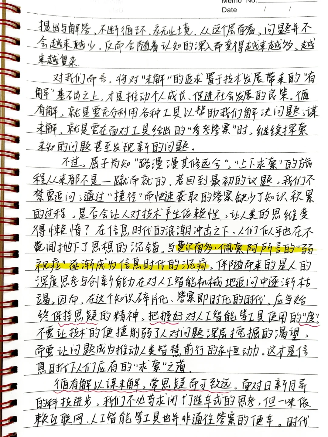 💭🔎📩摘抄了一篇优秀范文给你们看咯 这是今年高考卷的题目,相信大家已经看过很多篇关于这篇作文题目的解读了,不妨带着你对这篇作文题目现有的认识来读一下这篇范文吧。 多读无害,只有多看别人的优秀作文,我们才知道我们自己的作文哪里有问题喔,我之前高中的时候,语文老师就经常叫我们去看身边优秀的作文,大家相互看,一起学习呢。 👩🏻‍🏫标题: 随着互联网的普及、人工智能的应用,越来越多的问题能很快得到答案。那么,我们的问题是否会越来越少?(以上材料引发了你怎样的联想和思考?请写一篇文章。要求:选准角度,确定立意,明确文体,自拟标题;不要套作,不得抄袭;不得泄露个人信息;不少于800字。) 写作角度分析: ①学会提问,善用科技 ②问未有之问,求未有之知 ③人工智能可答疑,人生之惑须自解 ④一问一答不迭,新旧交替无尽 🥣🌊还有就是大家都知道前段时间女作家韩江入围诺贝尔文学奖的时事叭(介里可以去看我分享的10月时事素材篇),她的作品真的太🐮了 我最近就在读她的一本书 📚:《不做告别》 它里面讲述了小说家庆荷在写了一本描述屠杀的书之后开始做噩梦,她前往济州岛照顾朋友仁善的小鸟,并在那里发现了七十多年前济州岛大屠杀的历史。 (她的文字真的太有力量了,在她的笔下让我感受到了生命的脆弱) 读完我也很庆幸自己身在华夏,身在这个和平年代是何其的有幸!!!🌷🌷