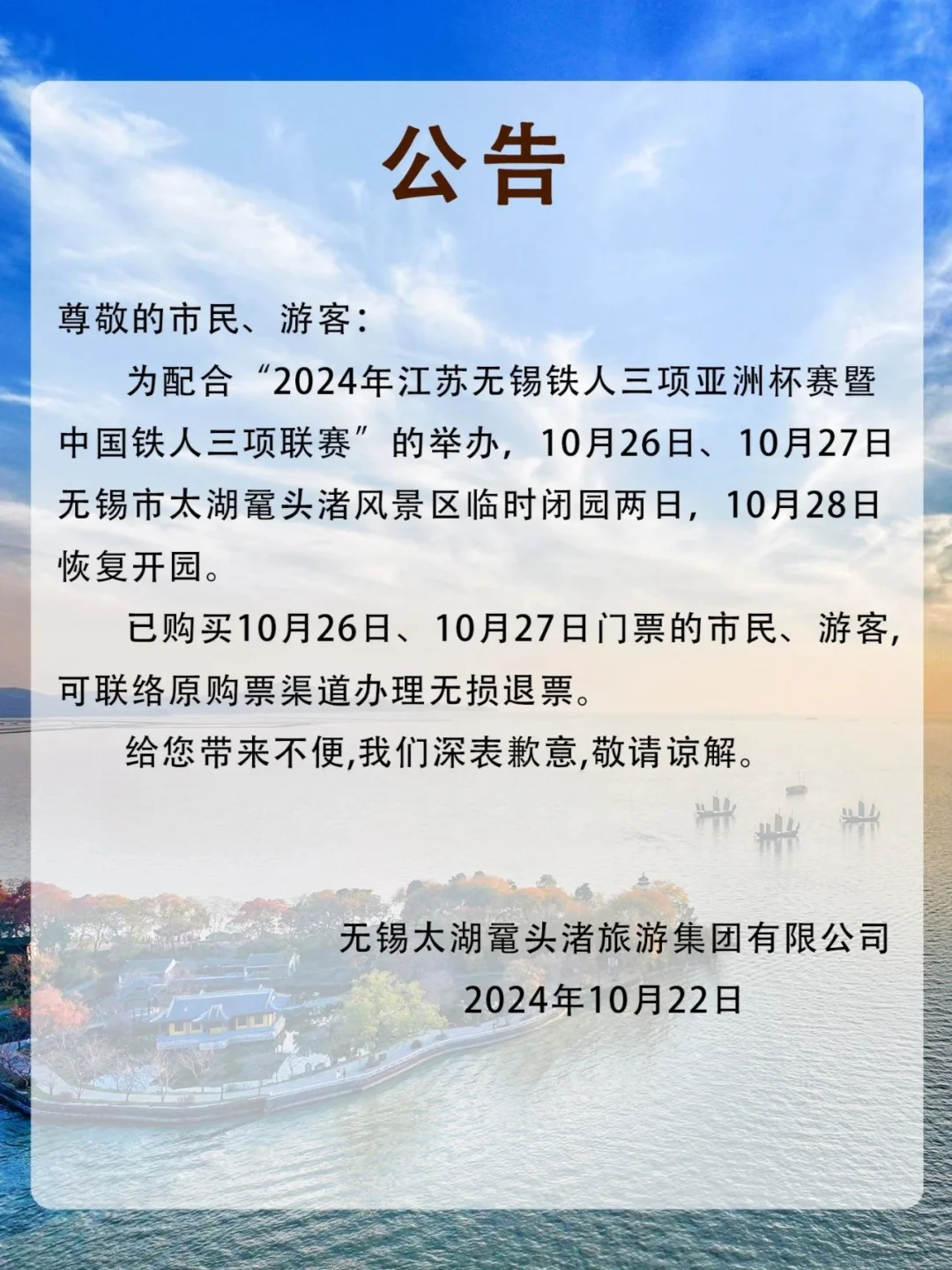 为配合“2024年江苏无锡铁人三项亚洲杯赛暨中国铁人三项联赛”的举办,10月26日、10月27日无锡市太湖鼋头渚风景区临时闭园两日,10月28日恢复开园。