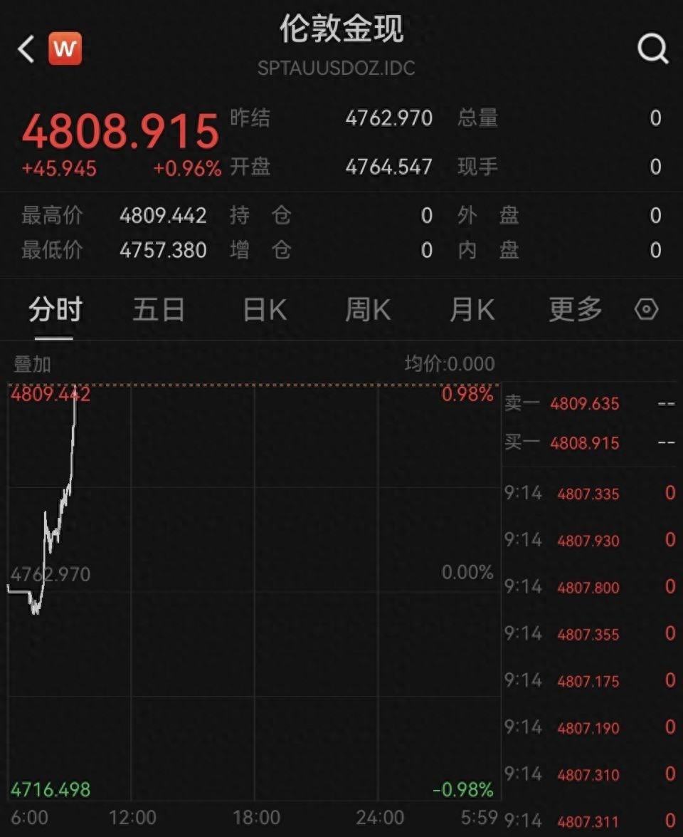 大河财立方消息,受美国威胁对欧洲多国加征关税推高投资者避险需求影响,国际贵金属价格1月21日继续走高,现货黄金史上首次站上4800美元/盎司整数关口,本月累涨超10%,涨幅逾480美元。
