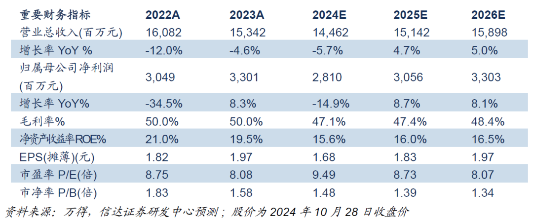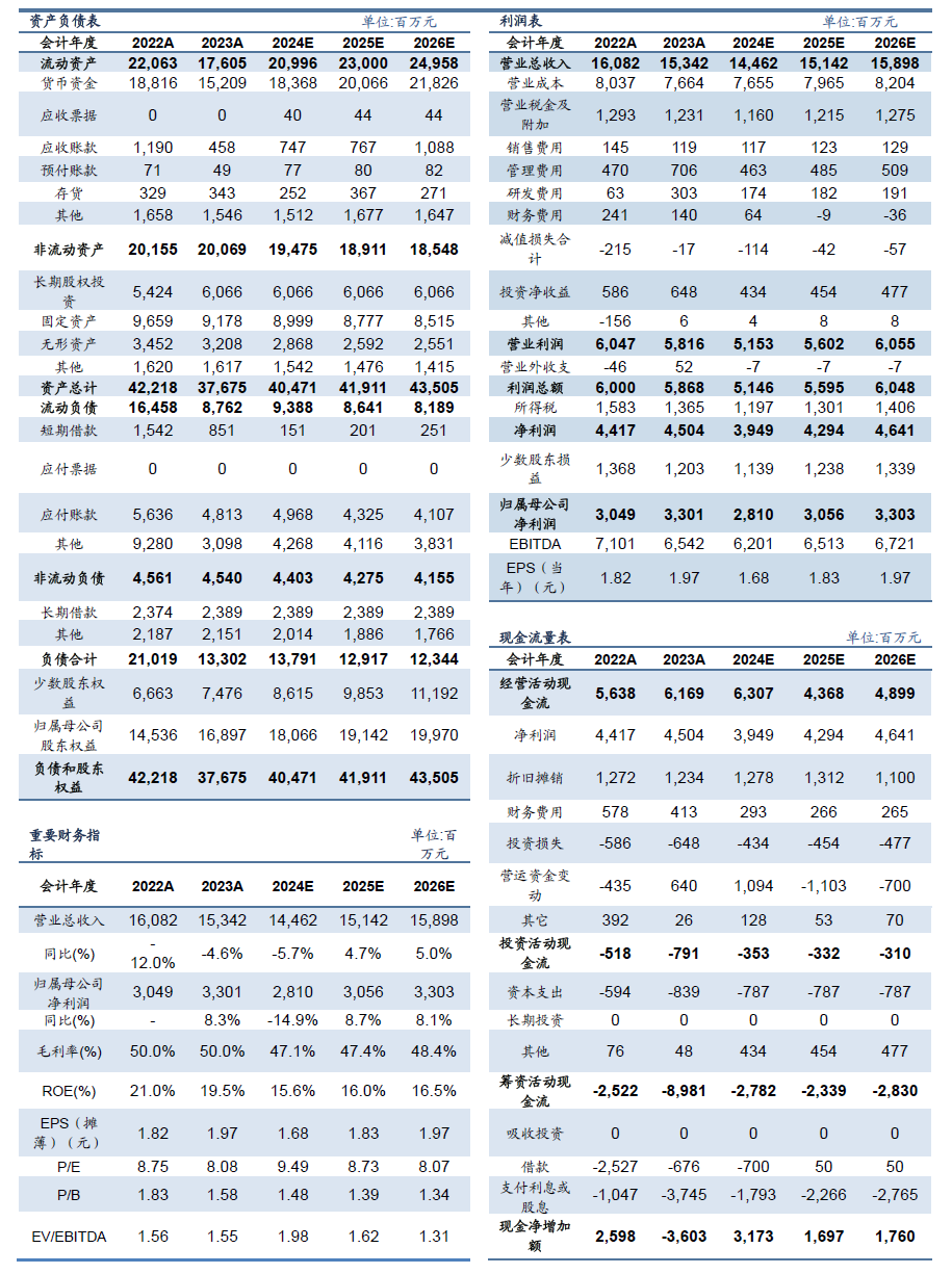 管理费用、财务费用同比降低,现金流充裕。公司2023年前三季度管理费用为4.7亿元,2024年前三季度管理费用为3.7亿元,同比-21.9%。公司资产负债率为30.0%,同比-7.4pct,环比-3.4pct,减少了利息支出,这使得公司财务费用由23年前三季度1.1亿下降至24前三季度末的0.5亿,同比下降57.8%,降幅较明显。截至2024年前三季度,公司货币资金159.8亿元,占公司归属于母公司所有者权益180.8亿元的88.4%,自有资金较为充裕。
