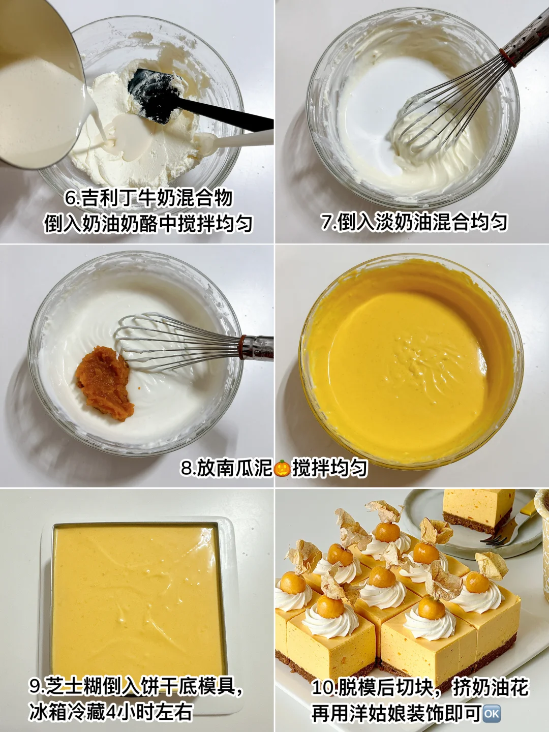 ③ 奶油奶酪加糖搅拌顺滑,倒入牛奶吉利丁液搅拌均匀,再倒入🫗淡奶油和南瓜泥混合均匀