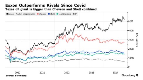 投资者对埃克森美孚的执行力表示满意。该股在最近几周创下历史新高,较疫情时期的低点已累计上涨了四倍。其同行一直在努力追赶,欧洲竞争对手英国石油(BP.US)和壳牌在低碳能源上押注失败后,正寻求重振化石燃料增长,而雪佛龙以530亿美元收购赫斯(HES.US)并进入圭亚那的交易在受到埃克森美孚的质疑后,在仲裁中陷入僵局。