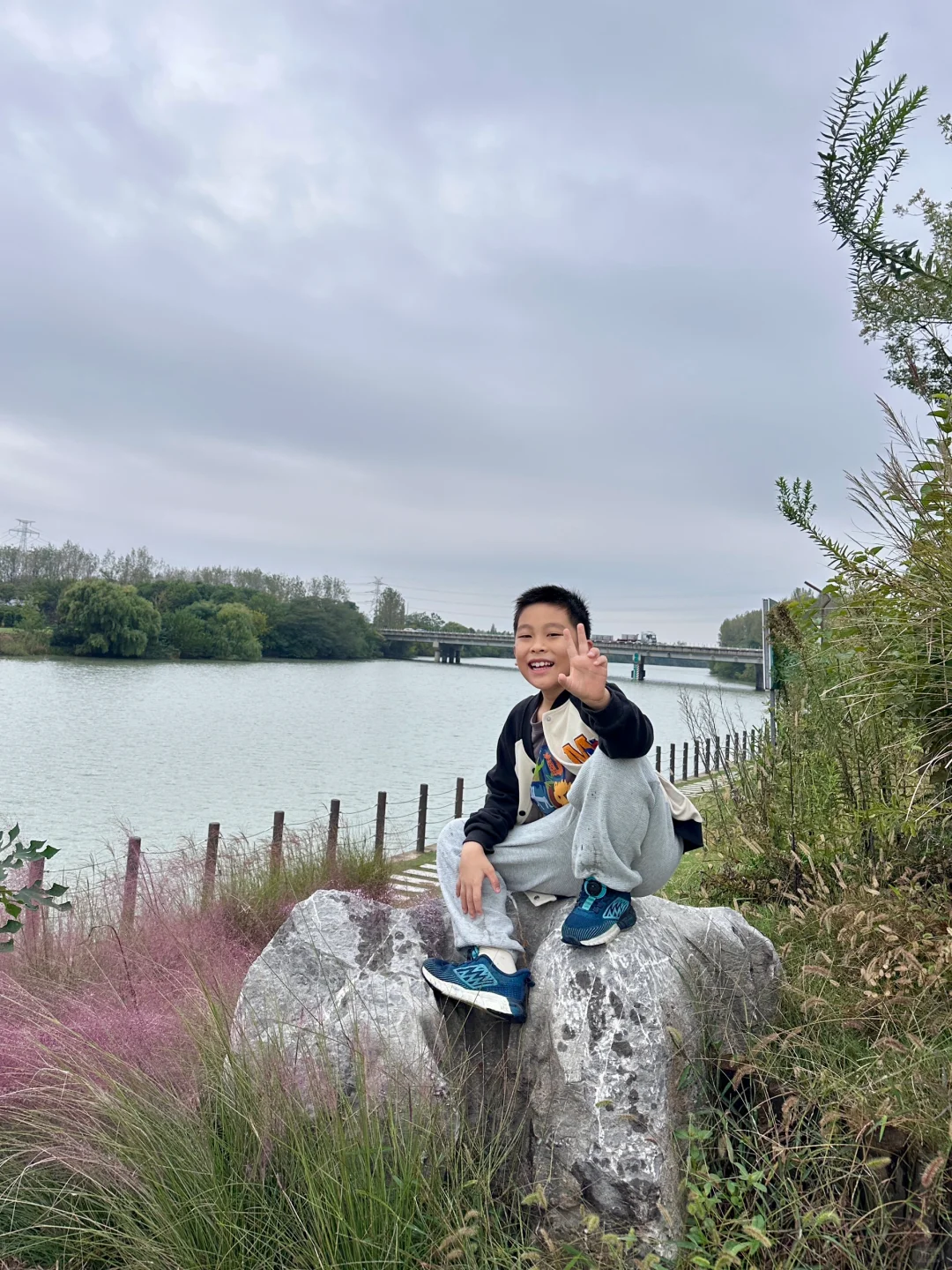 一直往前骑行会有个棠梨湾骑行驿站,听说也是凤隐梧桐家的,停下来拍照,路边很多无名小花,我们还拍到了粉黛草,孩子开心坏了。