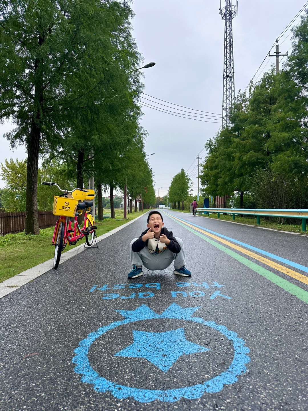 是这样的,我们住的是扬州凤隐梧桐度假酒店,办好入住,就去骑行了,亲子自行车也是酒店的,沿着运河骑行,🌈彩虹道很漂亮,地面还会有可爱的标语,我们都有记录下来。