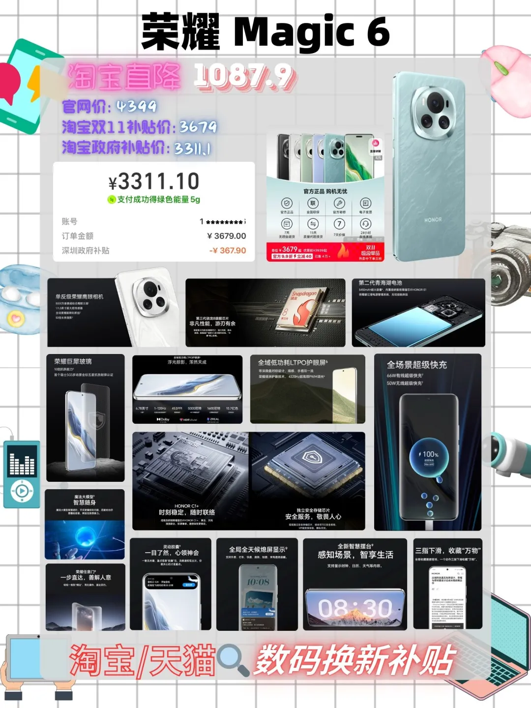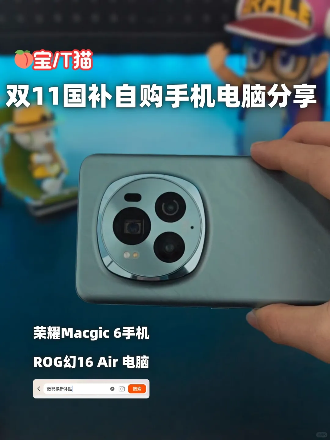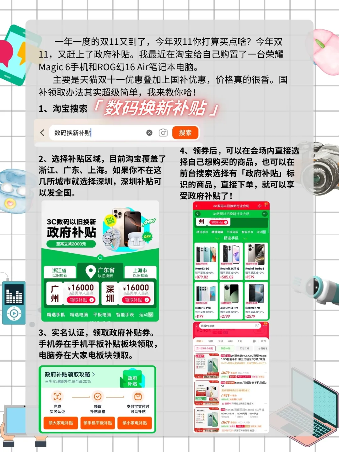 一年一度的双11又到了,今年双11你打算买点啥❗️ 今年双11,又赶上了政府补贴[哇R][哇R] 军儿最近在淘宝给自己购置了一台荣耀Magic 6手机和ROG幻16 Air笔记本电脑❗️❗️ 主要是天猫双十一优惠叠加上国补优惠,价格真的很香[喝奶茶R][喝奶茶R] 手机优惠了一千多,电脑优惠了两千多,真的好划算❗️ 国补领取办法其实超级简单,我来教你哈! 打开淘宝搜索“数码换新补贴”进入政府补贴换新专区❗️❗️ 根据自己所在的地区,领取自己想购买产品品类的优惠券[烟花R][烟花R] 然后再去选择自己想购买的商品(商品页面带有政府补贴) 这样在天猫双11下单的数码类商品,不仅可享官方立减优惠15%起 还有3C数码换新补贴至高2000元❗️ 88VIP还能领取大额优惠券,三重优惠叠加,至高补贴20%[庆祝R][庆祝R] 真的好优惠好划算!记住去淘宝搜索“数码换新补贴”