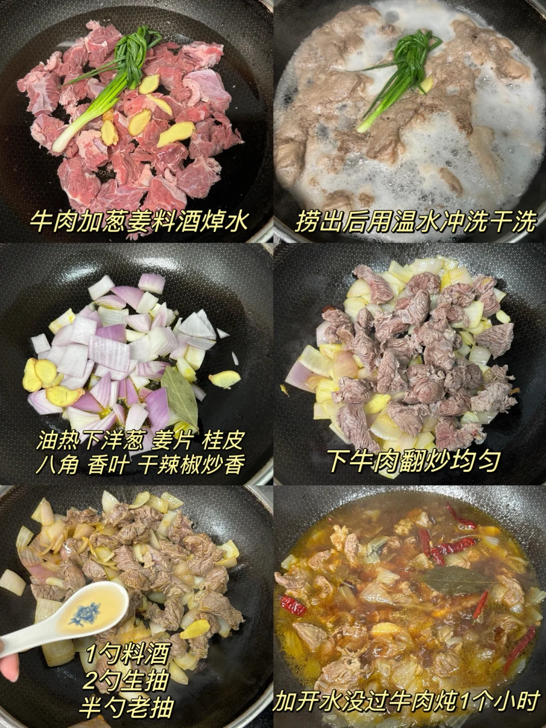 1️⃣牛肉选用牛腩或者牛肋条,切块冷水下锅,加葱姜料酒焯水捞出用温水冲洗干净