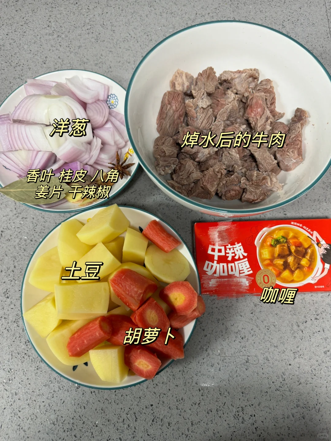 食材:牛腩、土豆、胡萝卜、中辣咖喱(选国货➕0反式脂肪酸)、洋葱、干辣椒、香叶、桂皮、八角、姜片、葱、牛奶