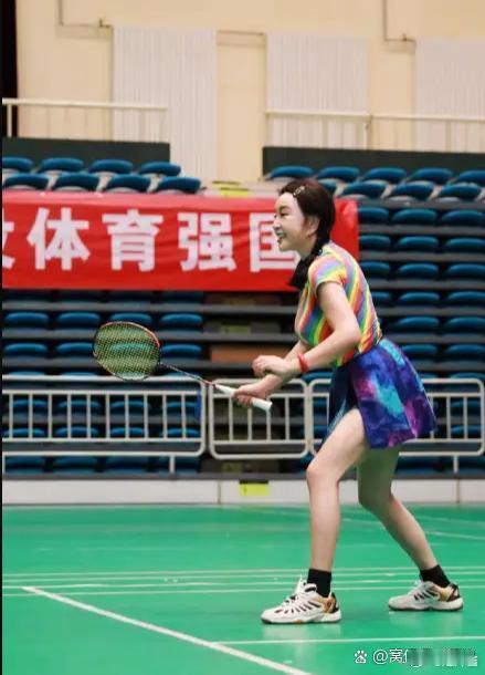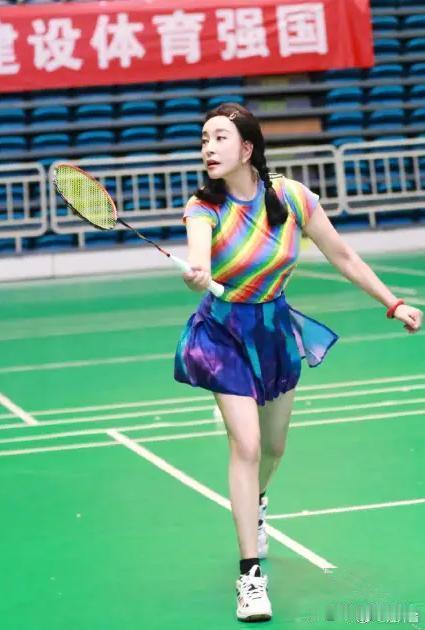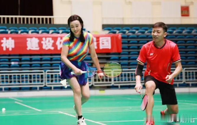 70多岁的刘晓庆绑着双马尾麻花辫,身着彩色运动装打羽毛球,活力四射,体力惊人。