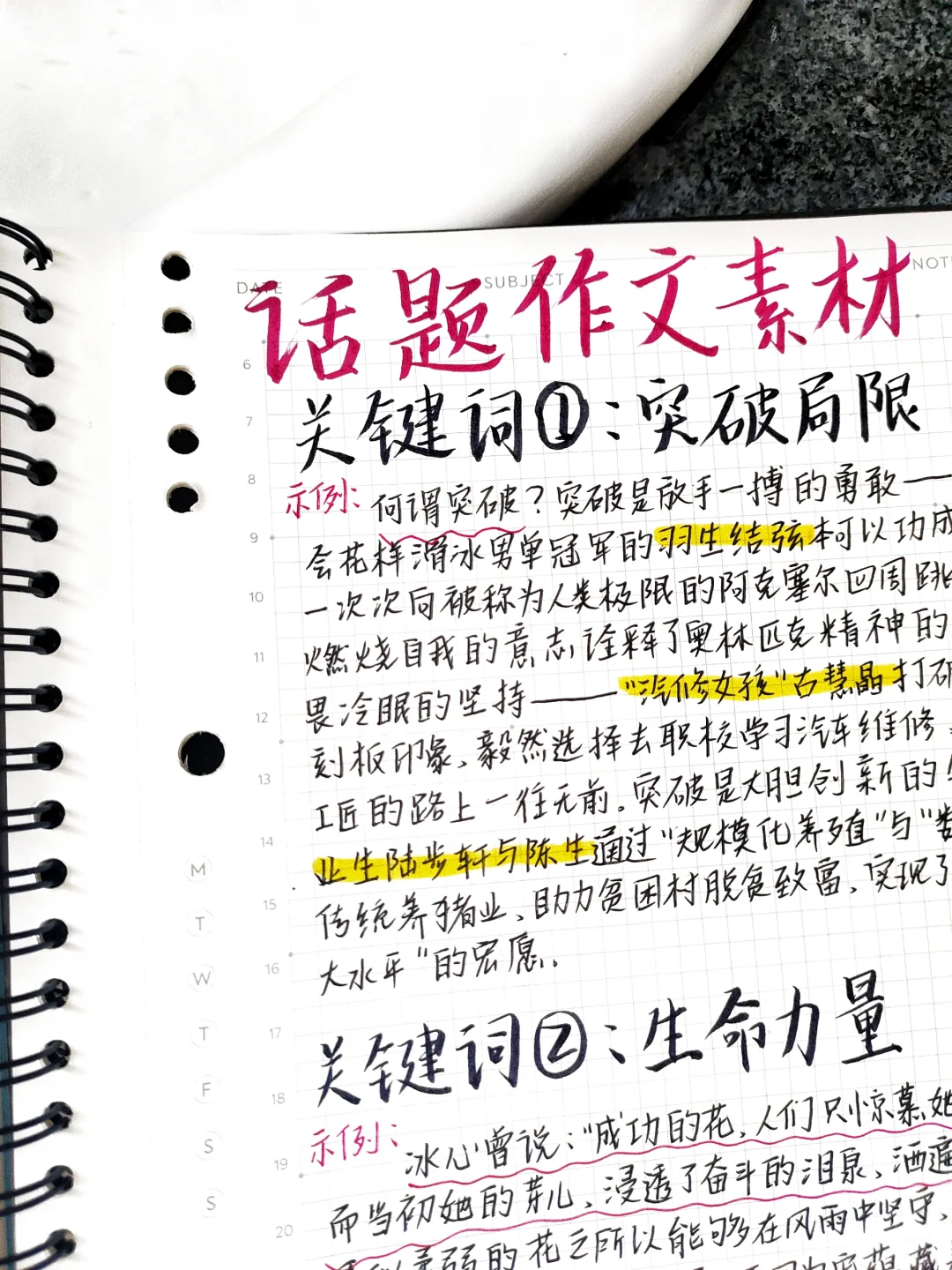 👏🏻一期有关关键词的写作示例 关键词①:突破局限 关键词②:生命力量 今日书摘: 人的命就像这琴弦,拉紧了才能弹好,弹好了就够了。永远扯紧欢跳的琴弦,不必去看那张无字的白纸。 (Human life is like this string,it can only be played well when it is tightened, and it is enough to play it well. Forever tighten the strings of joy,You don't have to look at that wordless blank piece of paper) --史铁生《命若琴弦》