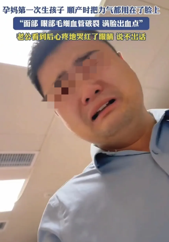 11月10日,山东一孕妈第一次生孩子,顺产过程中因不会用力了,结果把力气都用在了脸上。虽然孩子顺利产下了,但孕妈的面部、眼部毛细血管全部破裂,满脸都是出血点。这老公看到孕妈的模样,心疼地哭红了眼睛。