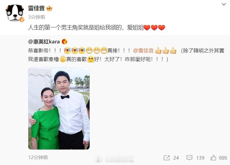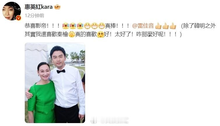 惠英红恭喜雷佳音获得金鸡影帝 惠英红还喜欢雷佳音演的秦桧 雷佳音获金鸡影帝,惠英红的恭喜充满对他表演才华的赞美。