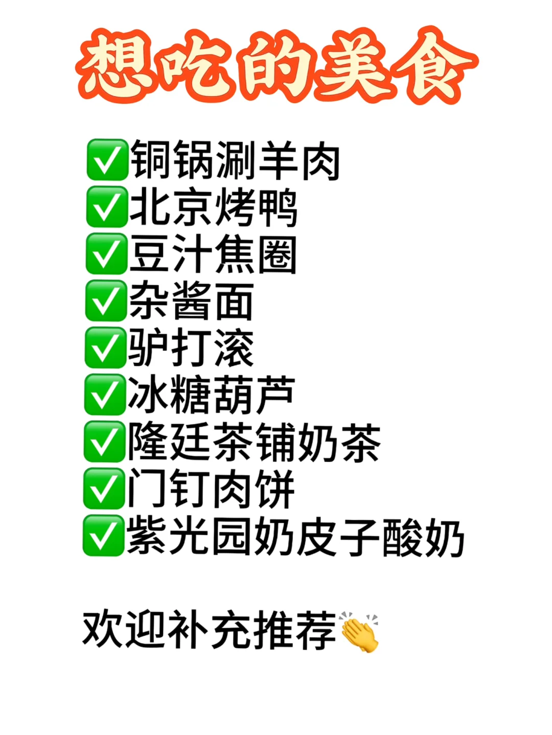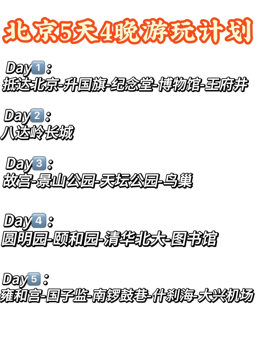 11月月底出发去北京,从广州白云机场出发✈️ 第一次去北京,计划了5天4晚的行程 给大家看看,有没有什么建议!!! 🌟5天4晚计划 Day1: 抵达北京-升国旗-纪念堂-博物馆-王府井 Day2: 八达岭长城 Day3: 故宫-景山公园-天坛公园-鸟巢水立方 Day4: 圆明园-颐和园-清华北大-图书馆 Day5: 雍和宫-国子监-南锣鼓巷-什刹海-大兴机场 🌟想吃的美食 ✅铜锅涮羊肉 ✅北京烤鸭 ✅豆汁焦圈 ✅杂酱面 ✅驴打滚 ✅冰糖葫芦 ✅肉饼 ✅奶皮子酸奶 欢迎补充推荐👏