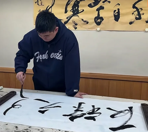 赵本山的儿子赵大牛最近可太厉害了!他秀书法题词 “反诈之王”,为了写好,硬是练习了五遍,直到自己满意为止,这对自己要求真严格。 他写字时一笔一划的,很有赵本山老师的风范。再看他身后挂着赵老师写的 “梅花香自苦寒来”,就知道他有多励志了。现在的赵大牛不光书法不错,还自己搞创作当导演,作品《反诈之王》也火了起来。