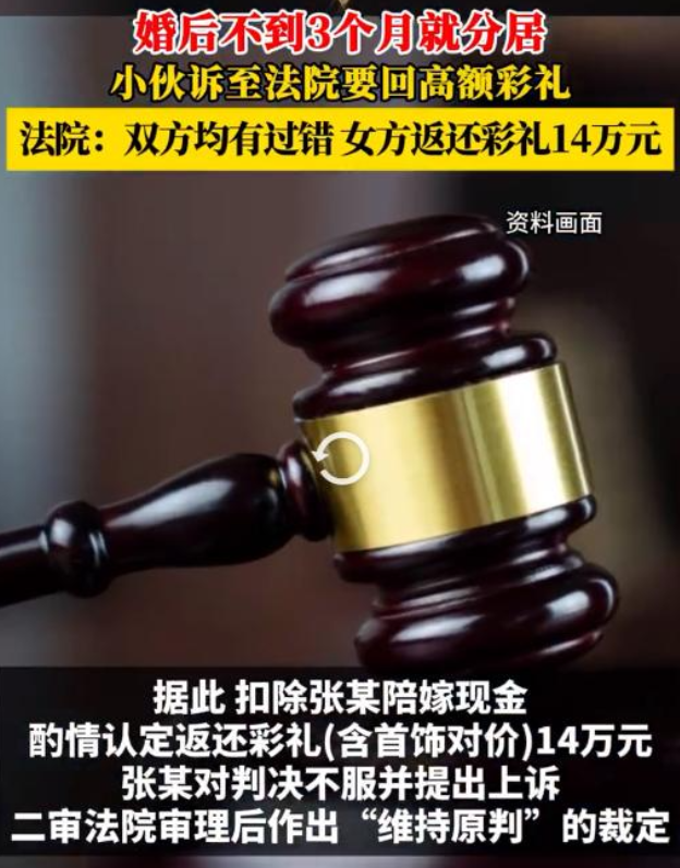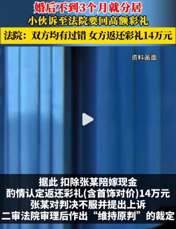 信源:惠眼新闻24-11-22——【婚后不到3个月就分居,小伙诉至法院要回高额彩礼,法院:双方均有过错,女方返还彩礼14万元】
