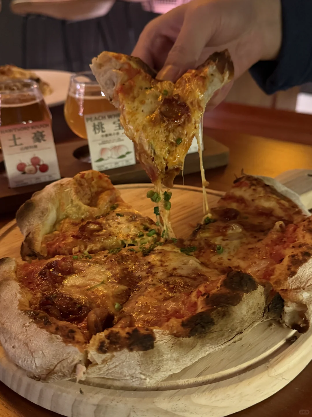 下酒菜tui荐披萨!纯手工的,现点现做!他们家有专门的披萨窑炉,烤出来的披萨饼皮又有韧劲又香脆!而且性价比超高,只要29.9r!