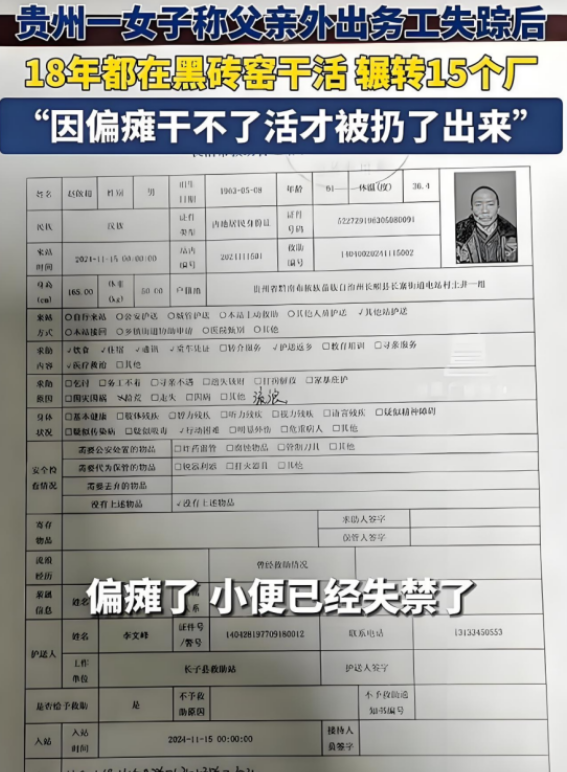 “人间炼狱” 贵州一女子的父亲失踪18年杳无音讯,11月15日被山西警方在桥下找到。一问才知道,父亲被拐到黑煤窑工作十八年,因为人老了浑身是病才给“丢”了出来。更恐怖的是,除了女子父亲外,黑煤窑里还有31个和他同口音的老乡。 赵启超坐在桥下,蜷缩成一团,拐杖靠在手边,旁边放着一叠皱巴巴的纸币,数了数总共510元。 这是他18年里唯一拥有过的“财富”…… 2006年,赵启超从贵州老家外出打工,家里的地早已种不出什么值钱的东西,赵启超和许多农村年轻人一样,想着到外地闯一闯,给家人寄些钱回去,改善家里的生活。 那年他36岁,身体强壮,干活利索,但谁也没有想到,那一别会是漫长的18年。 从出发的第一天开始,他的人生就脱离了掌控。他记得自己在车站迷路,遇到一个“好心人”主动搭话,说有一份砖窑的工作,管吃管住,工资还高。 赵启超当时没有怀疑,也没多问细节,他和“好心人”一同上了车。 刚到第一家砖窑时,赵启超便感受到与描述完全不同。环境极其恶劣,劳工被安排住在阴暗潮湿的宿舍里,没有窗户,连床铺都是硬木板。 他甚至来不及提出异议,就被几个壮汉按在地上,直接一顿毒打。他很快明白,这不是工作,而是奴役。 在黑砖窑,赵启超的日常生活是一场持续18年的炼狱。 早晨五点起床干到深夜,他用手搬砖,用肩膀扛石板,每一次动作都像在与身体较劲。长期高强度的劳动和极度恶劣的条件,迅速侵蚀了他的健康。 他的双手布满老茧,更像锉刀,右手甚至严重变形。他不记得被打过多少次,只记得很多夜晚,他带着肿胀的脸和瘀青的背部倒在硬板床上,连痛觉都变得麻木。 更可怕的是,逃跑是不可能的。 赵启超曾亲眼见过有人试图逃跑,却在刚离开砖窑不到半里地的地方被抓回。当着所有人的面,那名逃跑者被绑在柱子上,用棍棒狠狠打了一整天。 18年里,他几乎没有时间思考自己的家乡和家人。 工作时间太长,疼痛和饥饿让他的大脑无暇顾及过去或未来,他只记得一次次被转卖的过程中、老板不满意了,就会把他当作一件廉价货物,卖给另一个砖窑。 有时候,他被蒙上眼睛,丢进一辆卡车后斗,等再次睁开眼时,已经在另一个完全陌生的地方。 那么、他在这18年里“沉沦”到了什么程度? 他之所以重见天日,是因为早已身患脑梗、脑萎缩、长期营养不良、关节损伤,甚至大小便失禁等病症,没有了可榨取的利益价值。 据赵启超回忆,那天他被人架着丢在长治市的一座桥下,身上只留下510元、一根拐杖和一些饼干,而他的获救纯属偶然。 11月15日,路过的行人发现桥下有人蜷缩不动,于是报警。 当地警方赶到现场时,赵启超的模样让人不忍直视。他瘦骨嶙峋,头发蓬乱,皮肤干裂发黄,显然已经很长时间没有好好吃过一顿饭,也没有接受过任何治疗。 他能说出自己的名字和家乡,但说到这里就停了,不知道如何继续。警方将他送到救助站后,经过多方比对,终于确认了他的身份。 那一刻,赵启超的家人接到电话,得知他还活着时,泪水喷涌而出。 他的失踪早已让这个家庭支离破碎,父母含恨离世,他的妻子也因贫困而改嫁。几年前,当地派出所因长期没有找到他,甚至建议家人办理死亡宣告。 当赵女士一行人终于见到赵启超时,他的样子让人心酸不已: 脸上的皱纹仿佛比年龄多出了十几岁,曾经有力的身板变得佝偻不堪,双手布满深深的裂口。他看着家人,迟疑片刻后竟然微微一笑。 他的笑容里藏着一丝释然,也藏着更多的茫然。 在他被解救后,他提到,在黑砖窑里他曾与31名贵州老乡一同工作,其中不少是二三十岁的年轻人。他们同样被暴力驱使、剥削压榨,甚至在极端环境下失去了生命。 赵启超的身体需要长时间的康复治疗,户口恢复也是一项繁琐的任务,但他能活着回家,已经是一个奇迹。 在那些未被发现的黑砖窑中,还有多少个“赵启超”正在等待被解救?