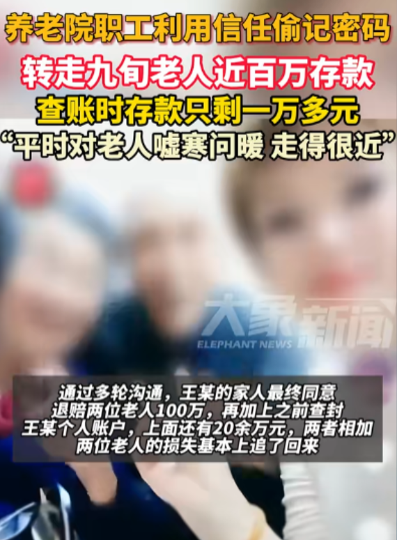 广州,九旬大爷和老伴存款百万住在养老院,养老院职工平常对他们嘘寒问暖,不曾想突然有一天,大爷查账时竟发现自己存款仅剩一万多,经查询竟是职工利用大爷的信任偷记密码,转走大爷近百万存款,大爷一怒之下将其告上法庭,法院判了! 广州一座环境优美的养老院里,九旬大爷张明轩和老伴安享晚年,他们性格开朗,待人和善,深得养老院职工的喜爱。 两位老人一生节俭勤奋,攒下百万存款,专门用于保障晚年生活,这笔钱对他们来说,不仅是多年来的积蓄,更是安全感的来源。 平日里,养老院的职工对张大爷和老伴格外照顾,时常嘘寒问暖,尤其是其中一名职工小李,表现得尤为热心。 她不仅帮两位老人打扫房间,还经常主动陪他们聊天,帮忙跑腿取药,张大爷一度觉得小李是个心地善良的好姑娘,对她的信任与日俱增。 一天,张大爷心血来潮,想查一查存款余额,顺便看看自己多年积攒的老本是否需要调整一下用度。 银行账户上显示的余额却让他目瞪口呆:账户里原本应有的近百万存款,竟然只剩下区区一万多元!他顿时觉得天旋地转,连忙让老伴一同核实,但结果无异。 两位老人震惊之余,立即拨通银行的客服电话,调取了账户的详细交易记录。 交易记录显示,近一年内,张大爷的账户多次发生大额转账,每次金额从几万元到十几万元不等,直至余额所剩无几。 令人细思极恐的是,这些交易并未通过银行卡进行,而是通过网上银行转账完成的,张大爷和老伴平日根本不会使用网络银行,更别说进行如此复杂的操作。 这些钱到底是怎么被转走的? 张大爷回想起平时接触的人,首先怀疑到了那位职工小李身上,他意识到,自己曾在一次不经意间透露过取款密码。 当时,他在为老伴买药时,因为记不清密码,随口提了一句,小李站在一旁,他并未在意。 而小李在那之后的表现也似乎变得更加热情,每次帮他操作银行卡或陪同出行时都显得异常熟稔。 张大爷找到小李询问此事,小李先是满脸无辜,随后却神情闪烁,匆忙解释说,这些钱是张大爷的大儿子让她帮忙转走的。 张大爷听后愤怒得几乎站不稳,他的大儿子早在十年前就已经因病去世,小李的这番话谎话连篇,大爷气得拍桌子,当场表示要报警。 警方介入调查后,小李的所作所为被彻底揭穿。 原来,她在张大爷无意中透露密码后,利用他对自己的信任,偷偷记下了密码,并在随后的一年时间里分批将老人的存款转至自己的账户,用于奢侈消费。 更令人发指的是,她甚至伪造了几张假转账凭证,试图蒙混过关。 案件进入法院审理阶段,小李在法庭上试图为自己辩解,称自己是“被委托”才转账的,法官凭借大量证据,直接驳回了她的辩词。 最终,小李被判处有期徒刑十年,同时需返还全部非法所得,并额外赔偿张大爷夫妇7万元作为精神损失费。 判决宣读时,张大爷和老伴相拥而泣,这场突如其来的灾难不仅让他们的积蓄险些化为乌有,更对他们的信任和内心造成了巨大伤害,但幸运的是,正义最终得以伸张。 张大爷坚定地表示:“这笔钱我和老伴攒了大半辈子,是我们晚年的保障,这件事不仅仅是钱的问题,更是我们的尊严问题!” 事件曝光后,引发了广泛关注,许多人对小李的行为感到愤怒,也对老人的遭遇表示同情。 与此同时,也有不少人提醒身边的长辈,保护好个人信息和财产安全,切莫轻易相信他人,以免类似的悲剧再次发生。