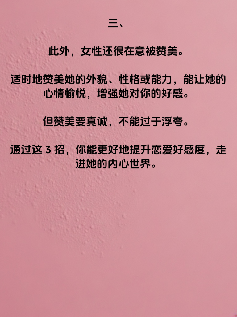 一、在恋爱中,了解女性心理密码至关重要。女性往往更注重细节,一句贴心的问候,一个温暖的眼神,都能瞬间拉近彼此的距离。比如在约会时,提前了解她的喜好,选择她喜欢的餐厅或活动,会让她感受到你对她的用心。 二、心理学告诉我们,女性对安全感的需求极高。在相处过程中,要让她感受到你的稳定和可靠,不要轻易做出承诺,但一旦承诺就要兑现。给予她足够的陪伴和关心,让她知道在你身边是安全的。 三、此外,女性还很在意被赞美。适时地赞美她的外貌、性格或能力,能让她的心情愉悦,增强她对你的好感。但赞美要真诚,不能过于浮夸。通过这 3 招,你能更好地提升恋爱好感度,走进她的内心世界。